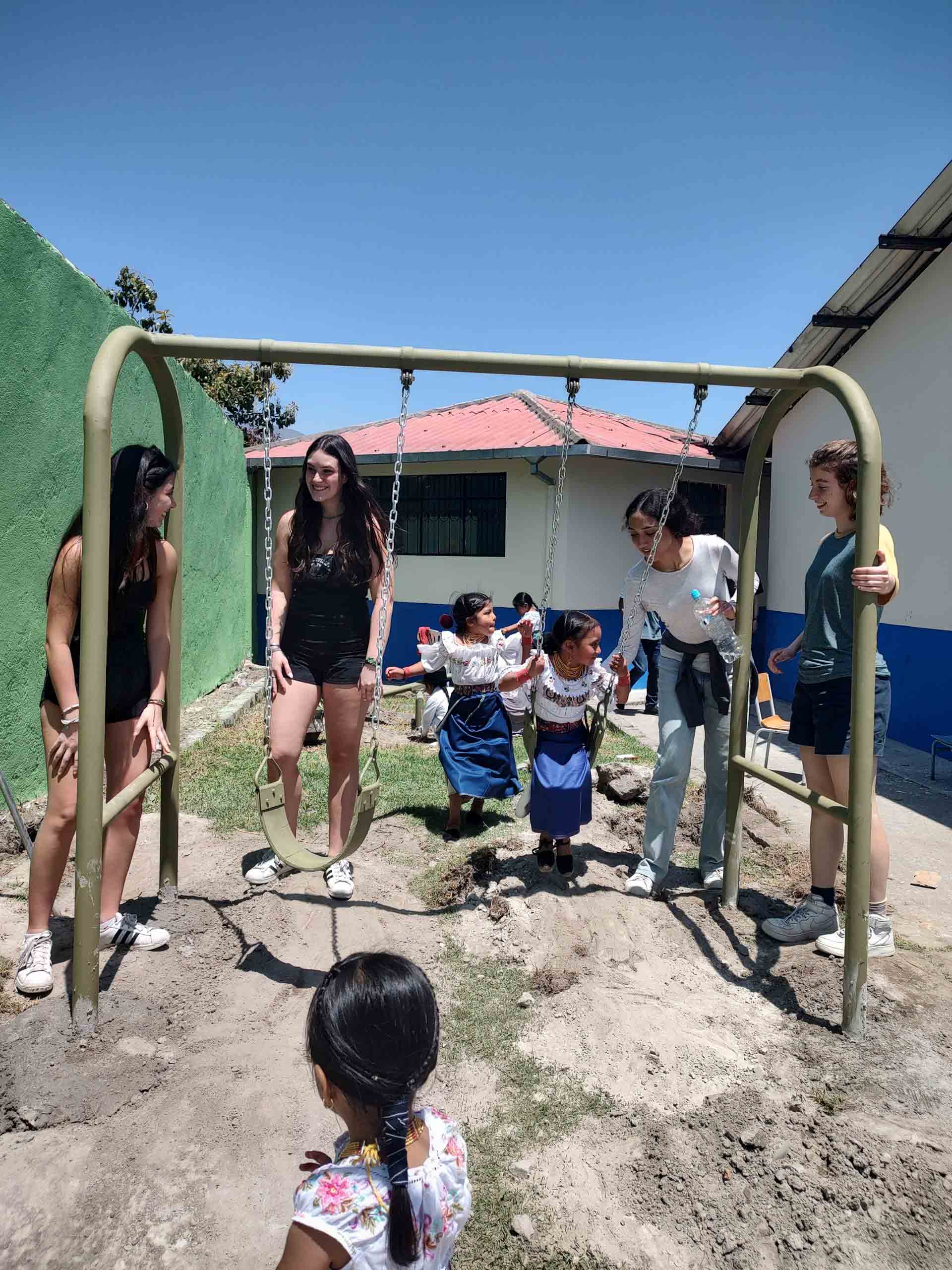 A group of students playing with children on a swing.