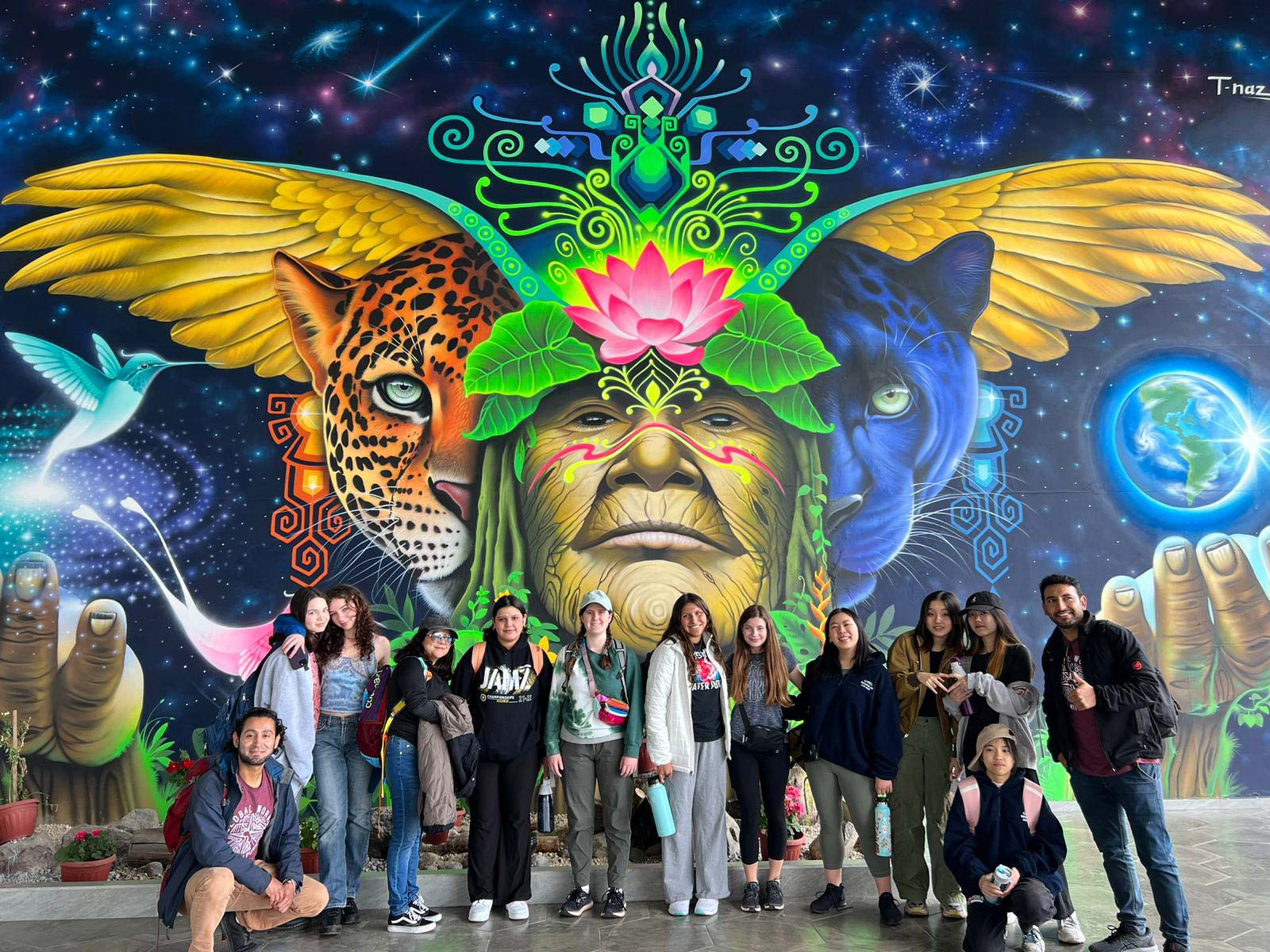 A group of students in front of a mural in Ecuador.