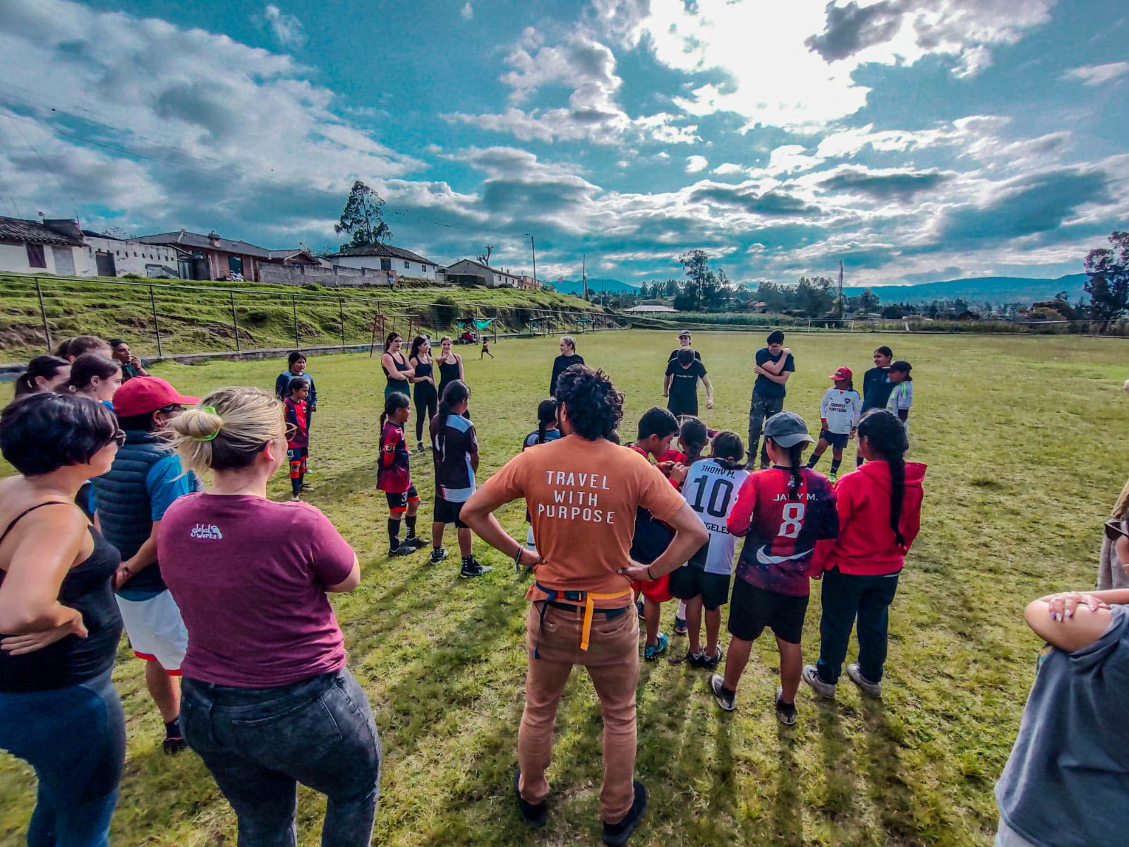 Students ready to play soccer with children in Ecuador.