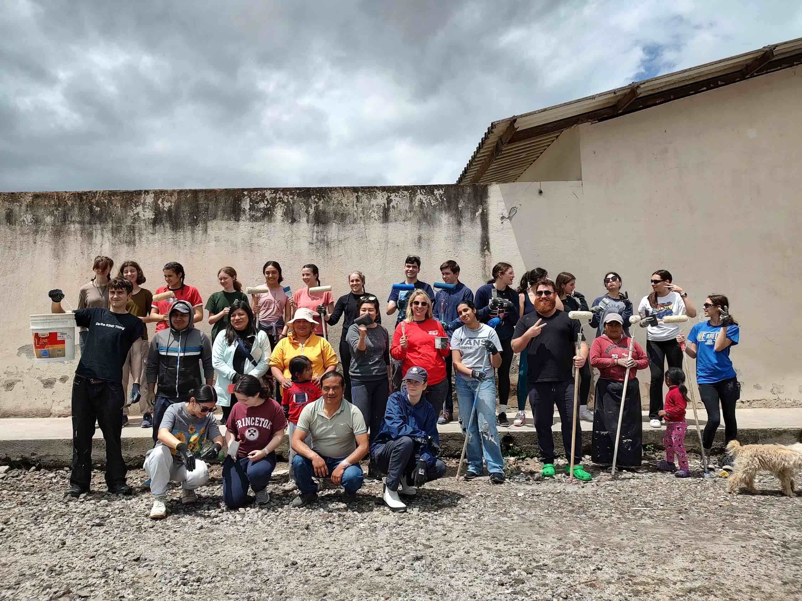 A group of people pose for a photo outdoors against a weathered wall. Some hold tools and a dog is present.