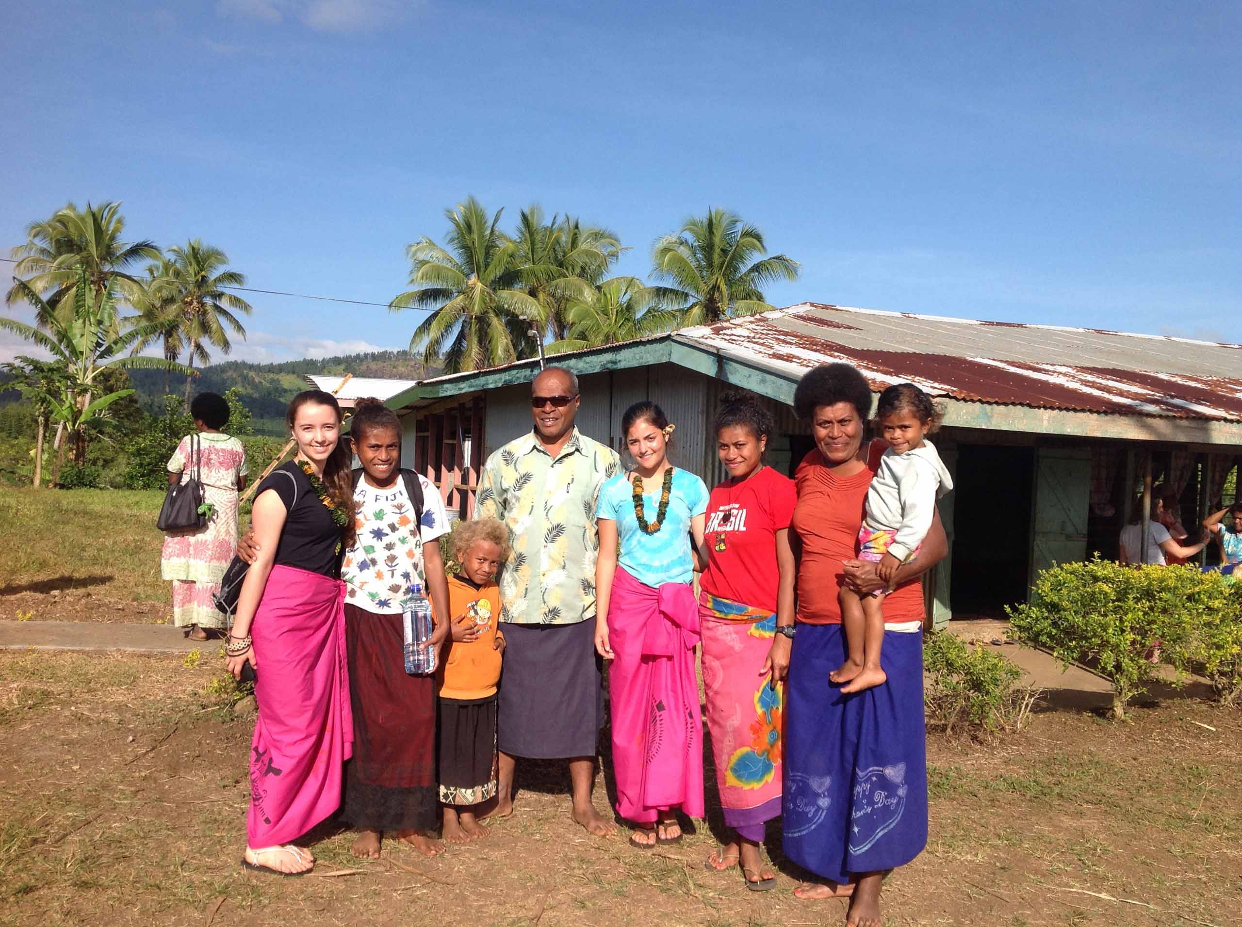 A group of people, including adults and children, stand smiling in front of a building in a tropical setting with palm trees. Some wear colorful traditional attire.