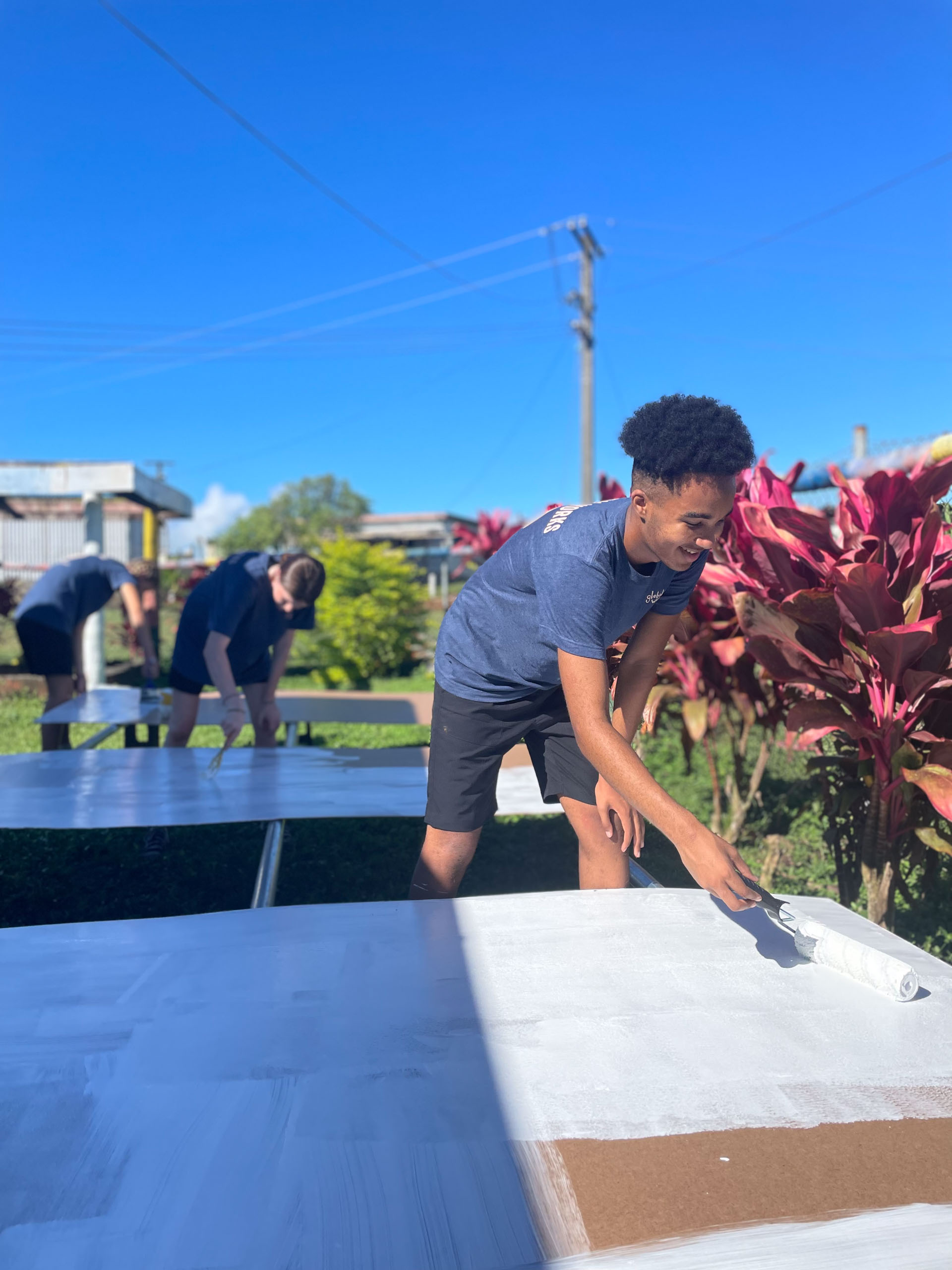 People painting large boards white outdoors in a sunny garden setting, with red plants in the background.