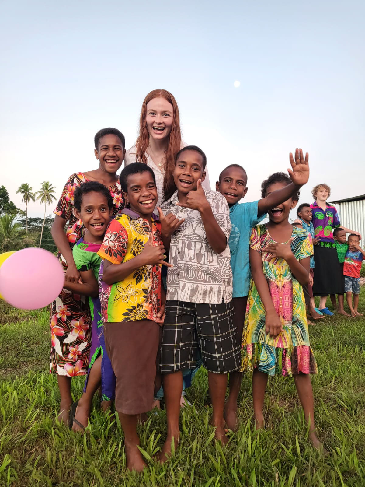 A group of smiling children and an adult stand on grass, with palm trees and a few adults in the background. One child holds a pink balloon.