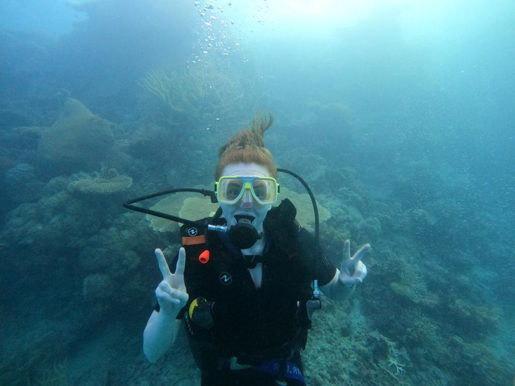 Scuba diver underwater wearing a diving suit and yellow goggles, making peace signs with both hands against a backdrop of coral.