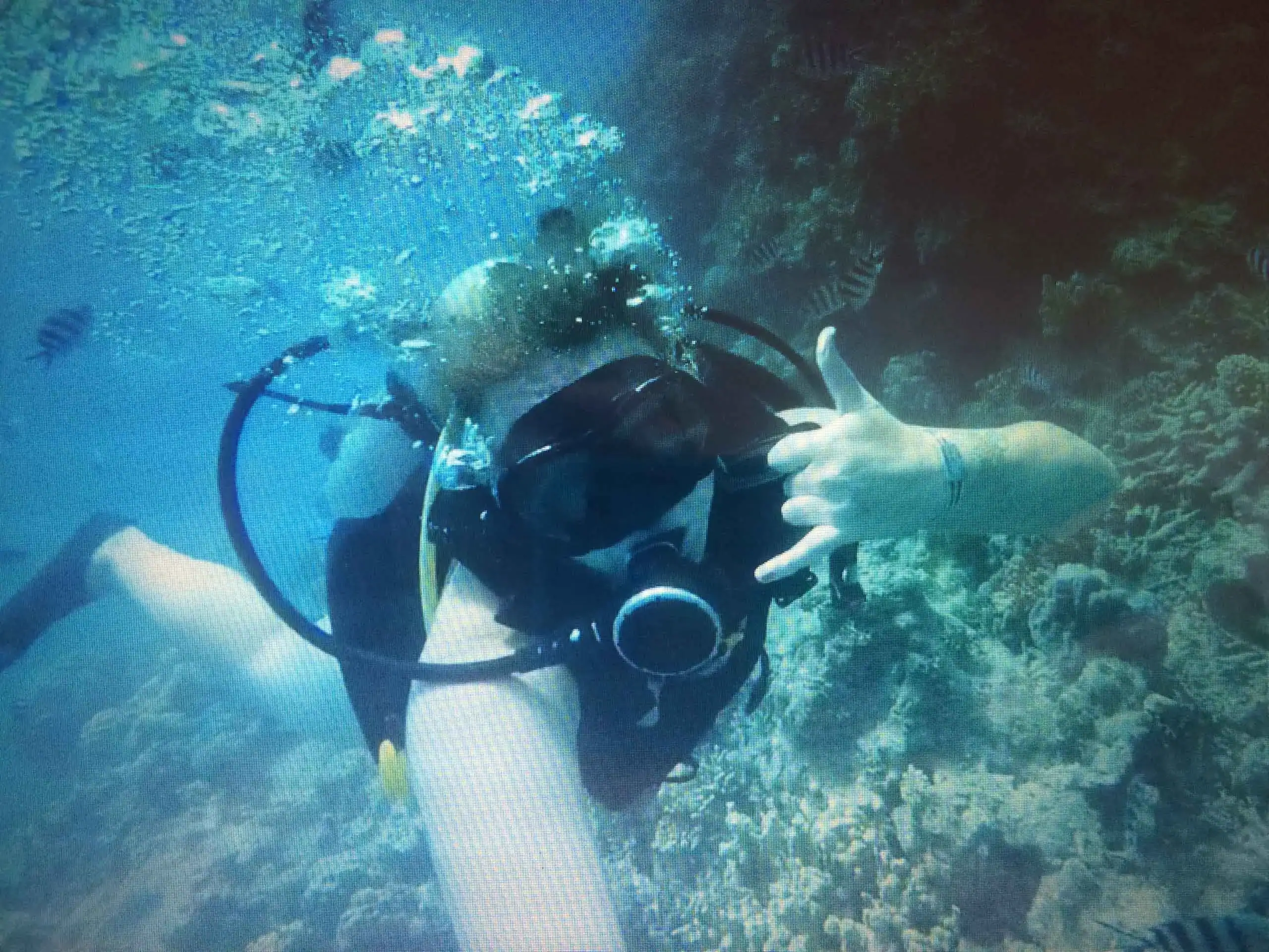 A scuba diver underwater, making a hand sign, with bubbles rising and coral visible in the background.