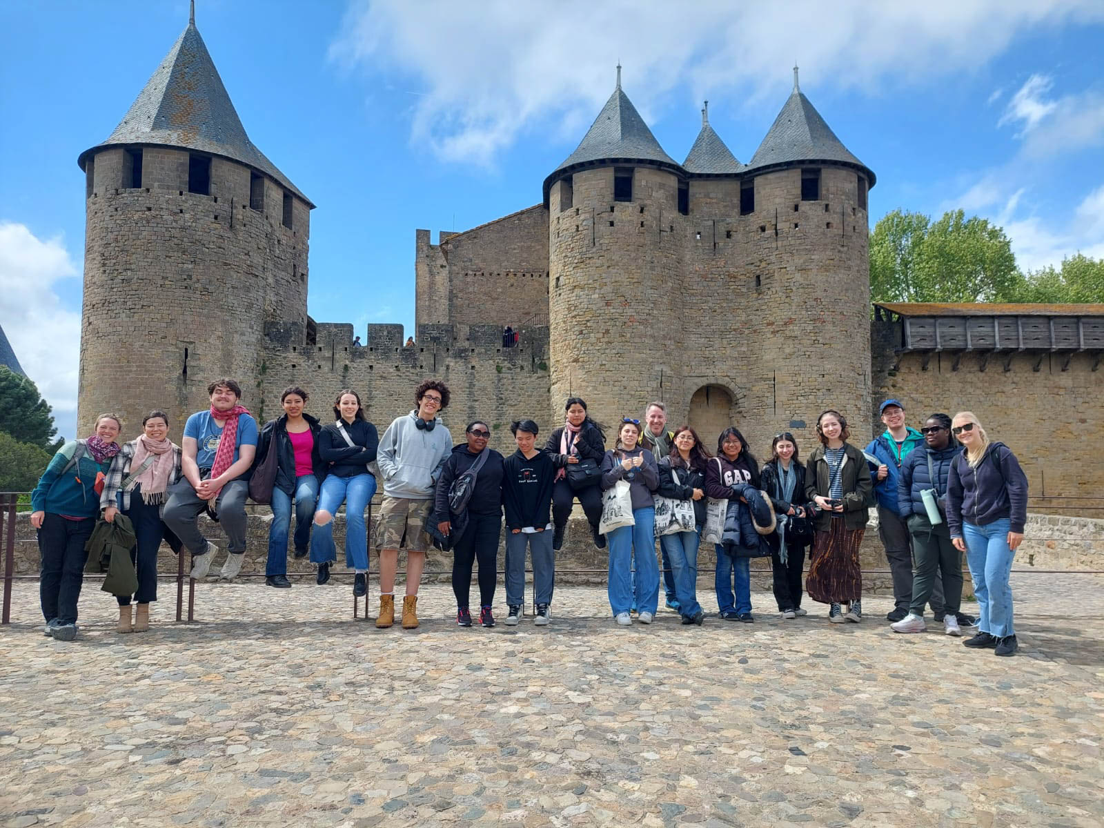 A group of people pose in front of a historic stone castle with round towers and conical roofs on a cobblestone plaza. The sky is partly cloudy.