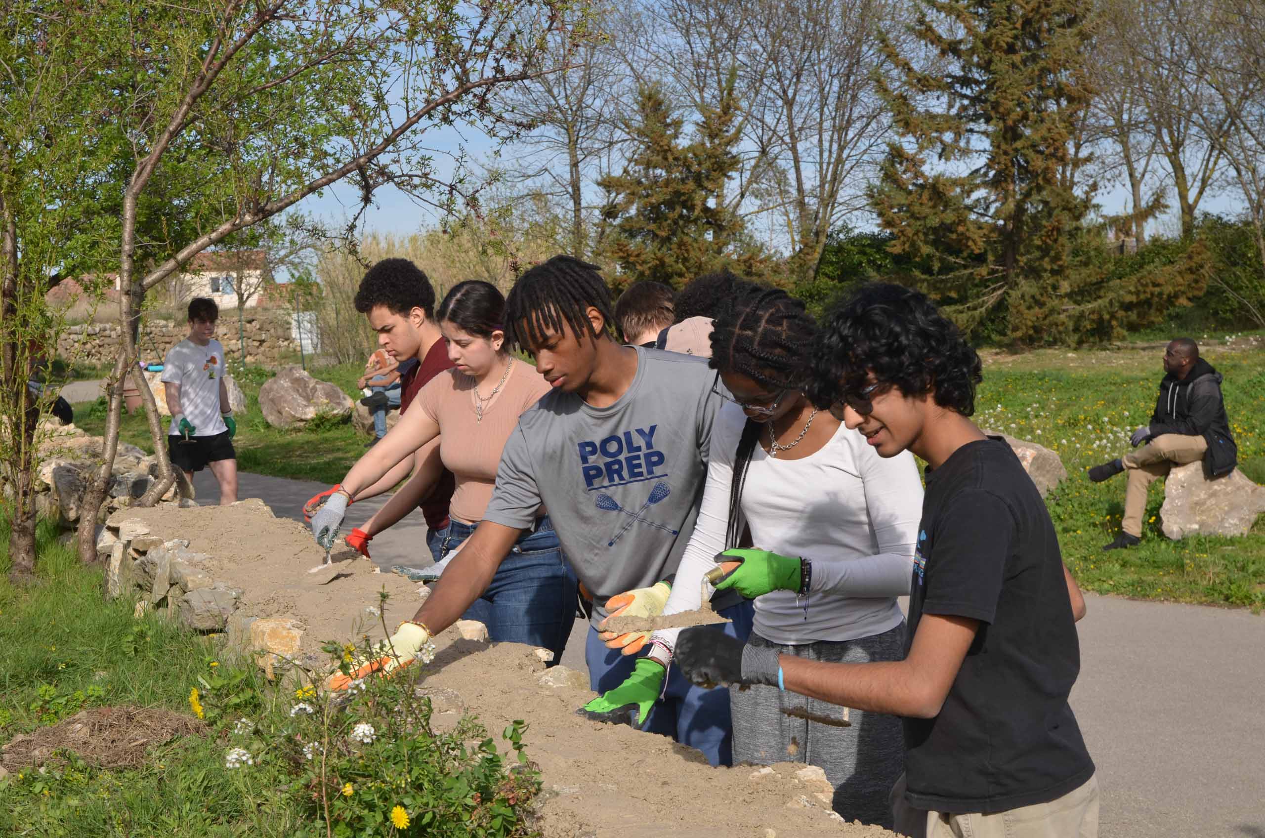 A group of people working together to build a stone wall outdoors on a sunny day.