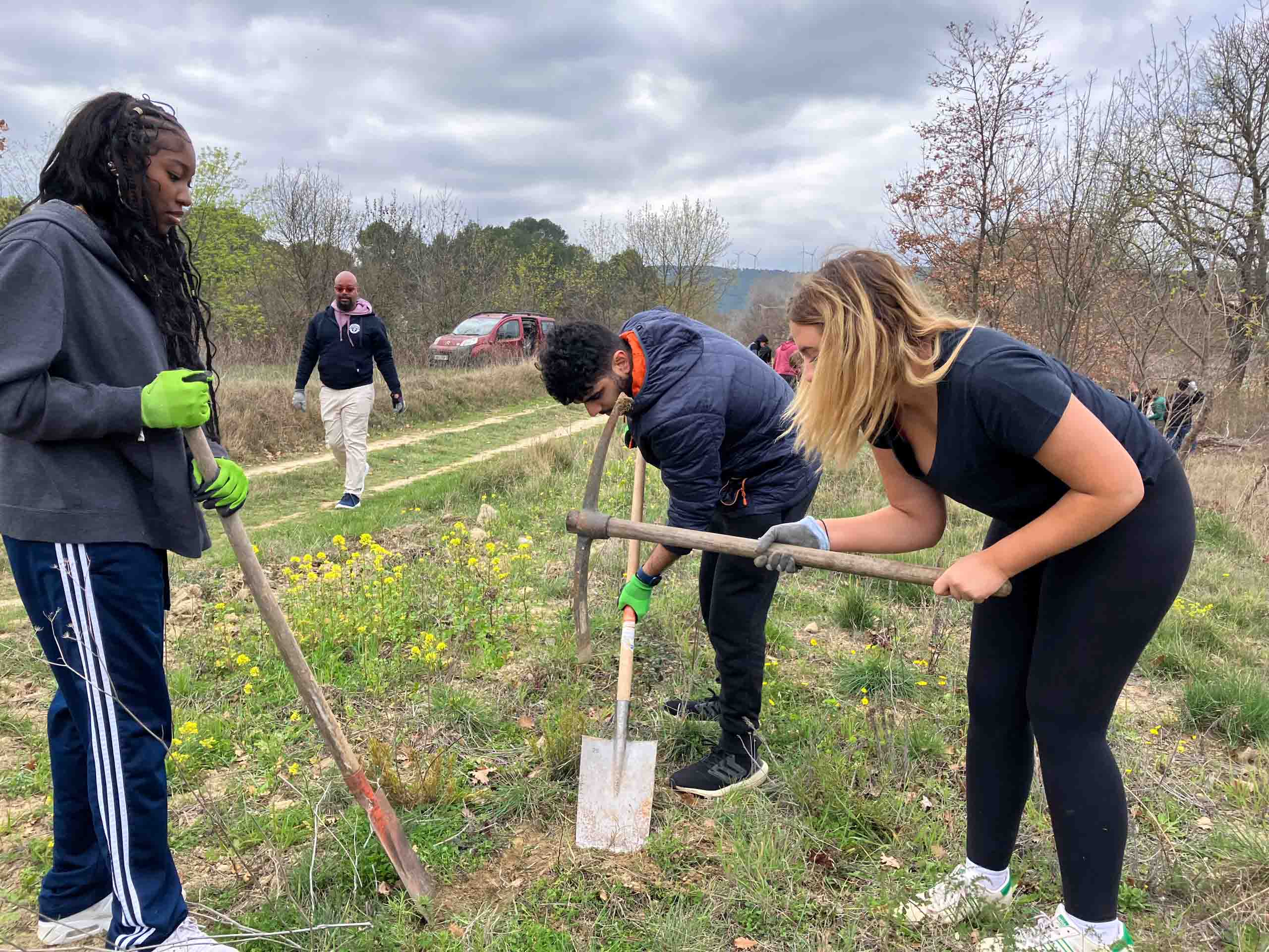 Three people use shovels and tools in a grassy, open field, while two others stand nearby. Overcast sky.