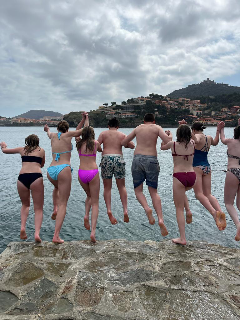 A group of people in swimwear are jumping into the water from a rocky ledge, with hills and buildings visible in the background.