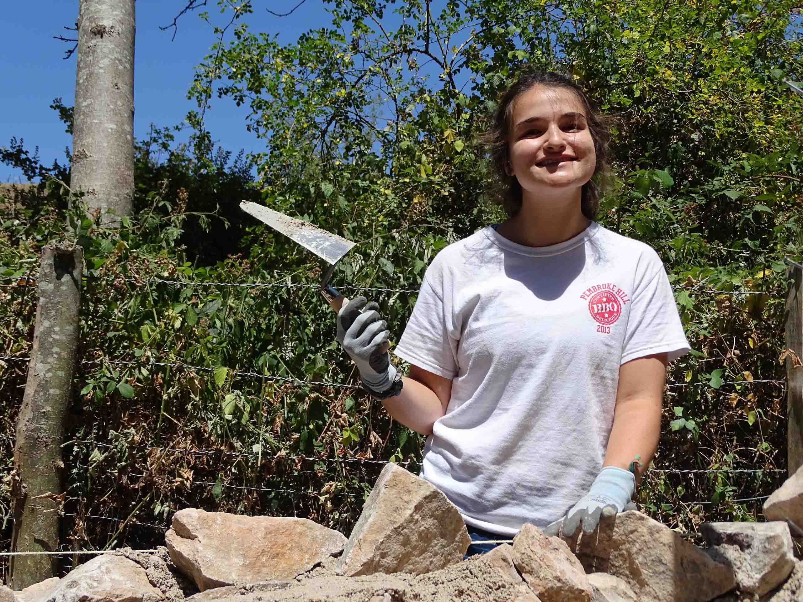 A person wearing gloves and a white T-shirt is smiling while holding a trowel, standing behind a partially constructed stone wall in a wooded area.