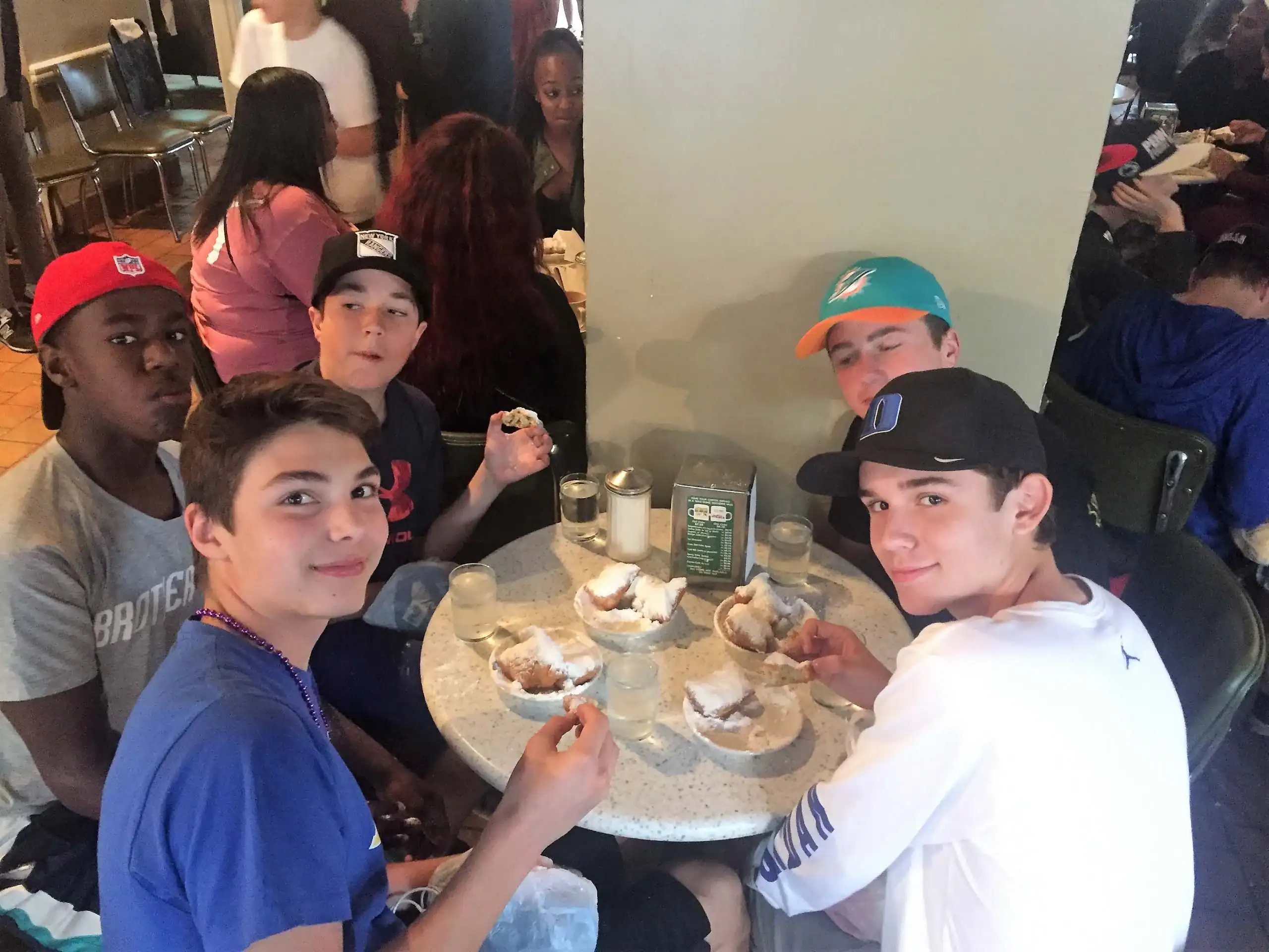 Five young people sit around a table eating beignets at a cafe. Each person wears a cap.
