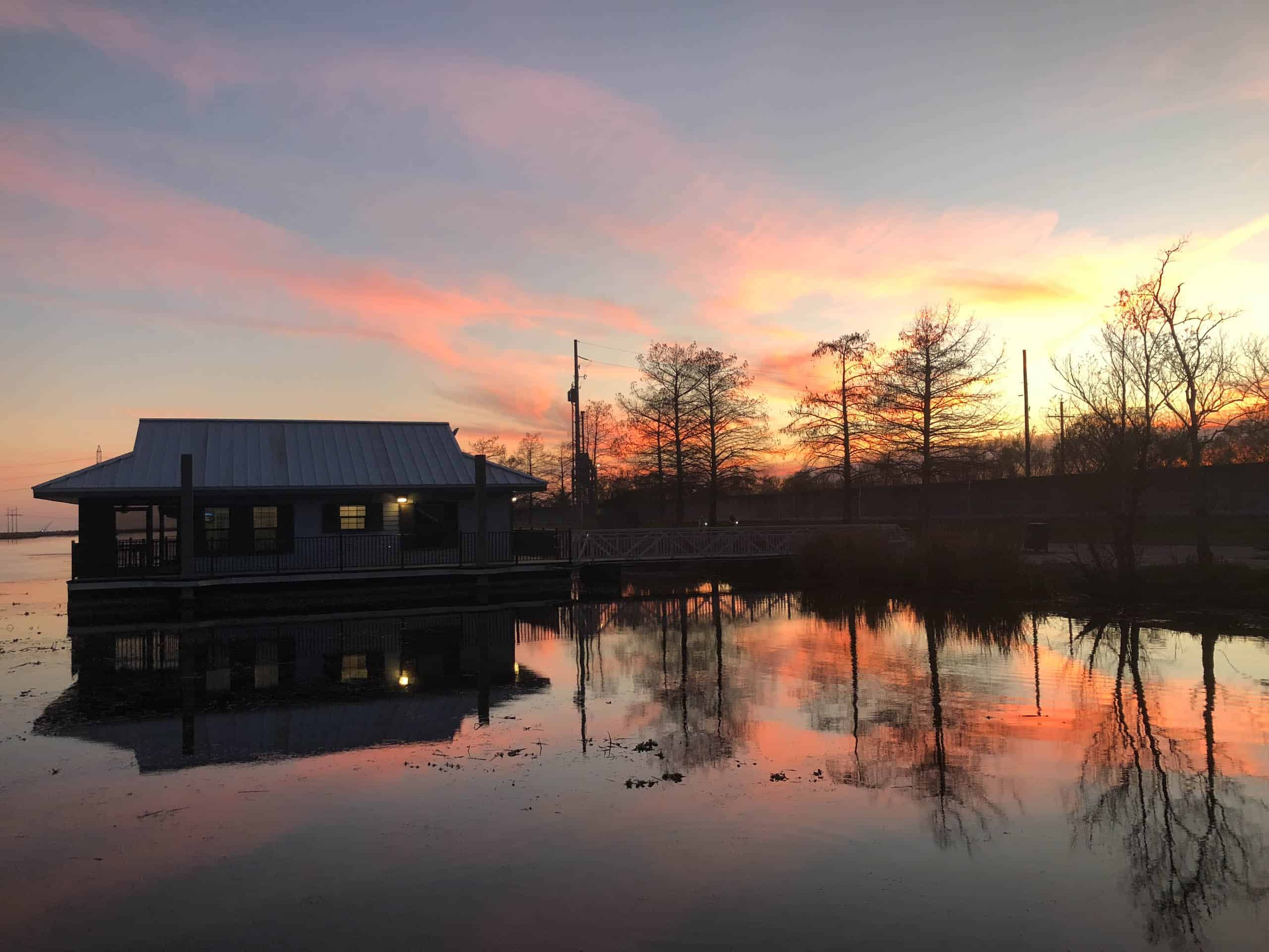 A small building sits by a calm lake during sunset, with trees and vibrant orange and pink clouds reflecting on the water's surface.