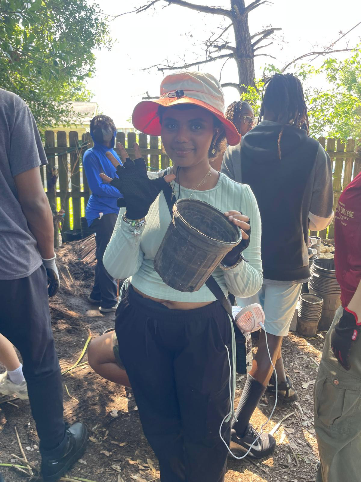Person wearing a hat and gloves holds an empty pot while standing outdoors with a group of people.