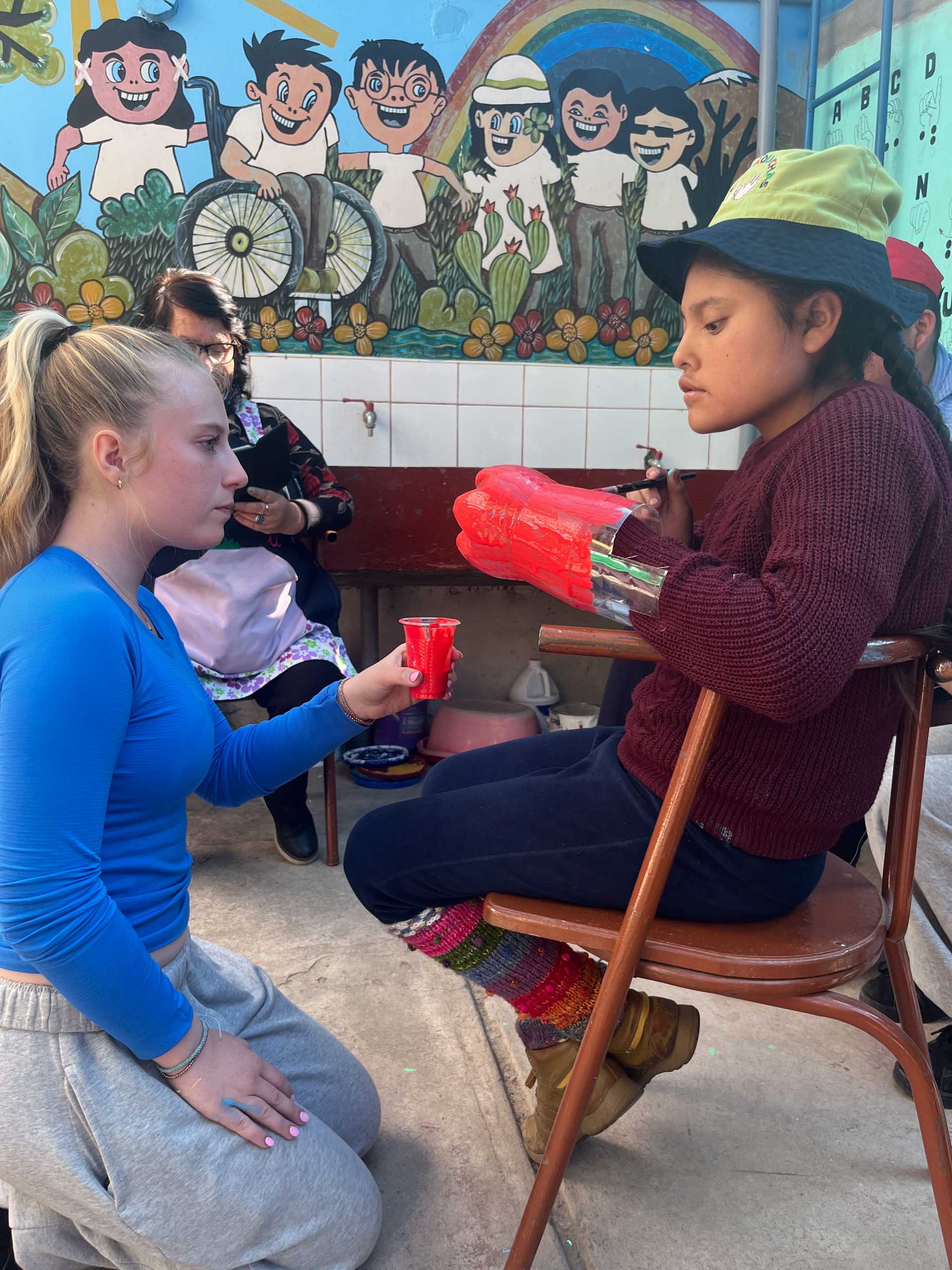 Two children engaged in craft activity; the child in the chair holds papier-mâché gloves, while the other kneels, holding a red brush. Colorful mural in the background.