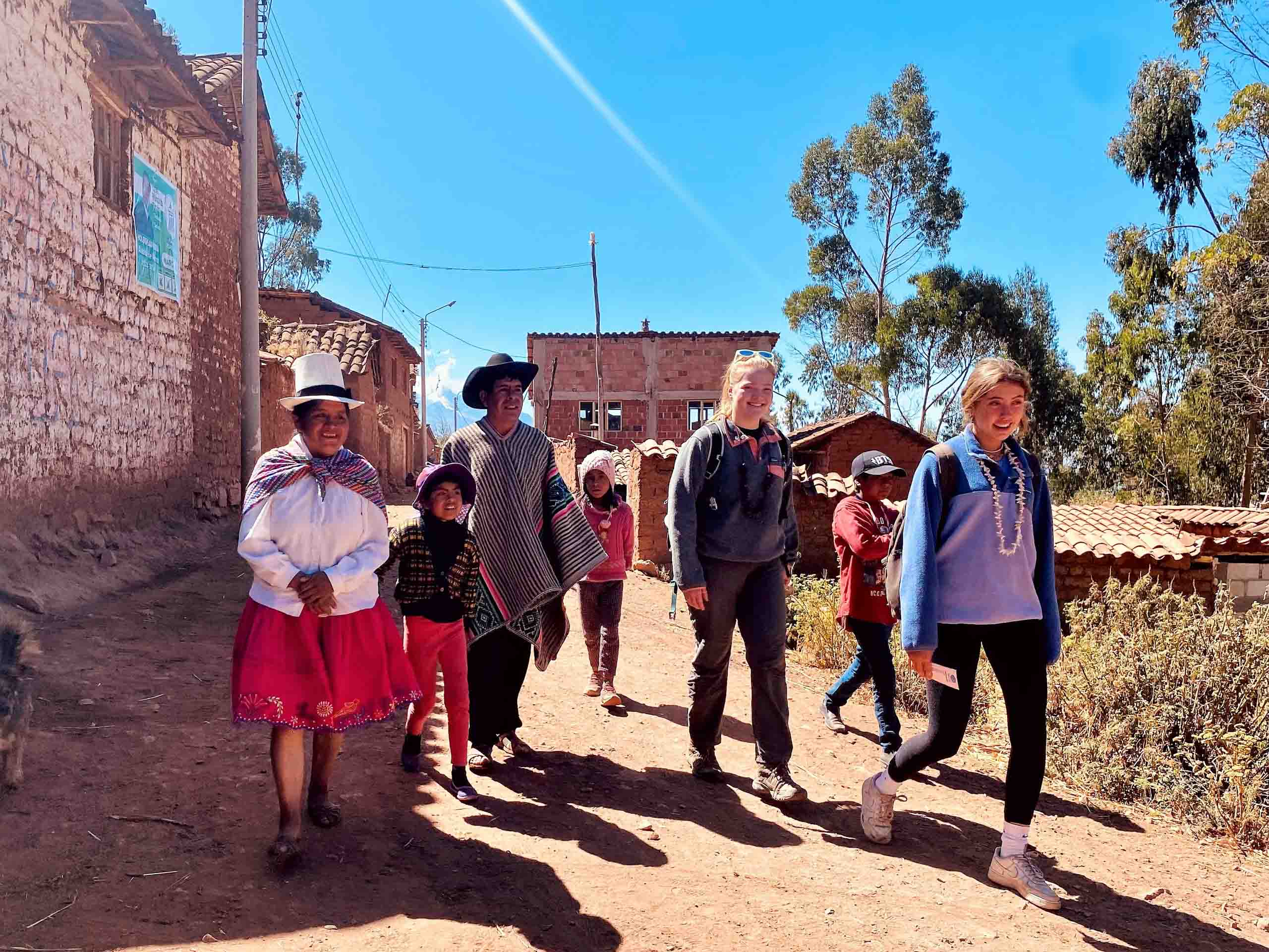A group of people, including children and adults, walk along a dirt path in a rural village setting, with brick buildings and trees in the background under a clear blue sky.