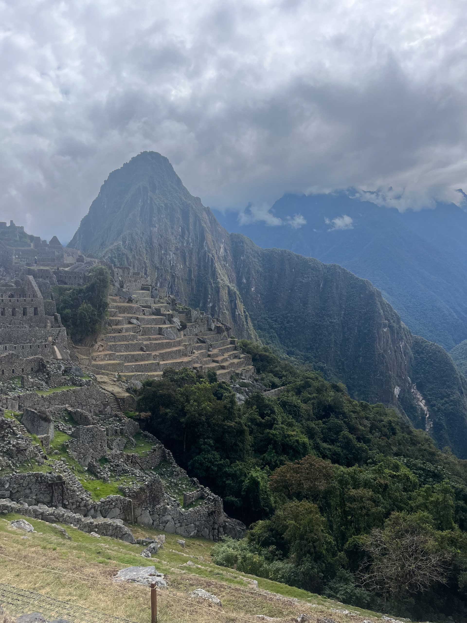 View of Machu Picchu with terraced ruins and a mountain backdrop under a cloudy sky.