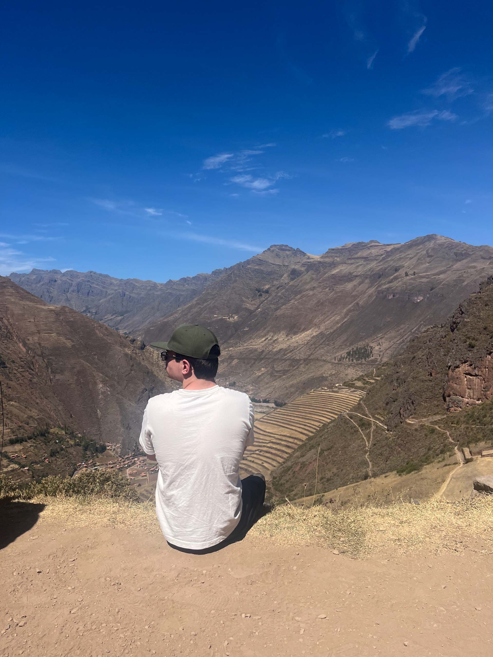 Person sitting on a hillside, wearing a white shirt and green cap, overlooking a valley with mountains and terraces under a clear blue sky.