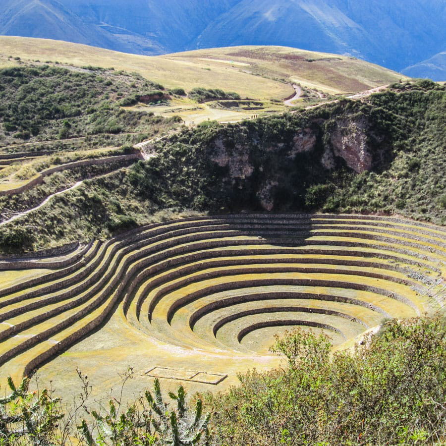 Terraced circular agricultural site set in a sunken depression with surrounding hills and paths under a clear blue sky.