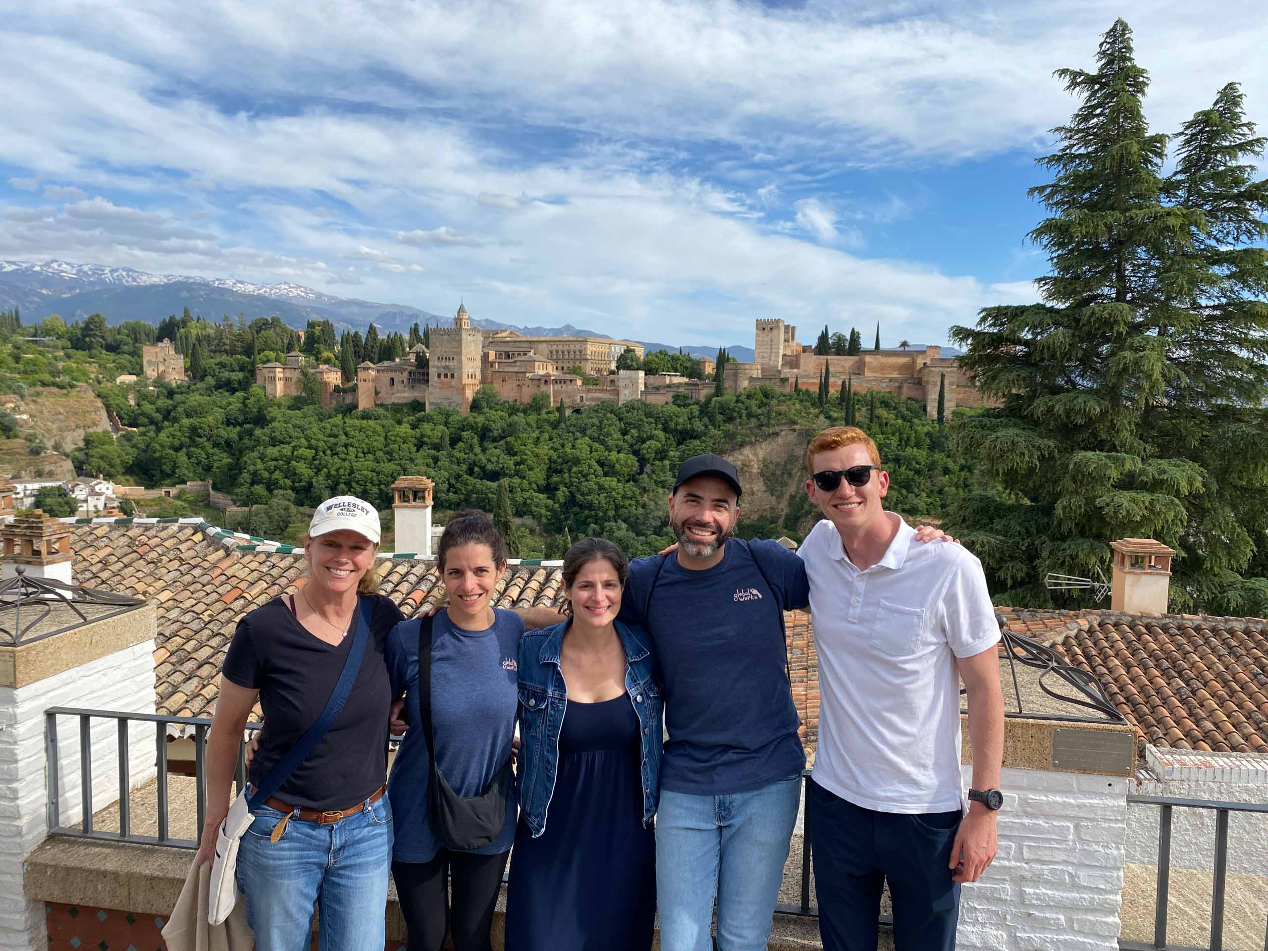 A group of five people standing together with a scenic view of a historic city and green landscape in the background.
