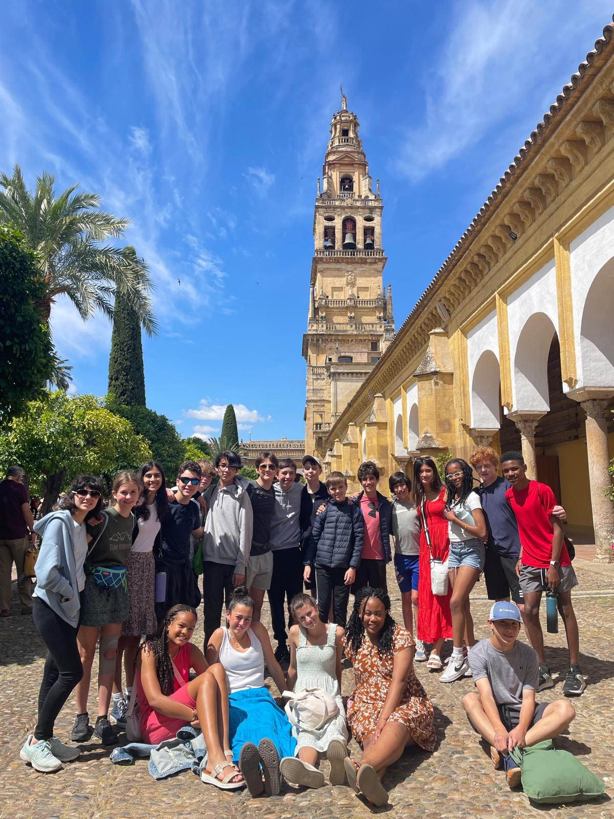 A group of people pose for a photo in front of a historic bell tower and arches, with a blue sky and palm tree in the background.