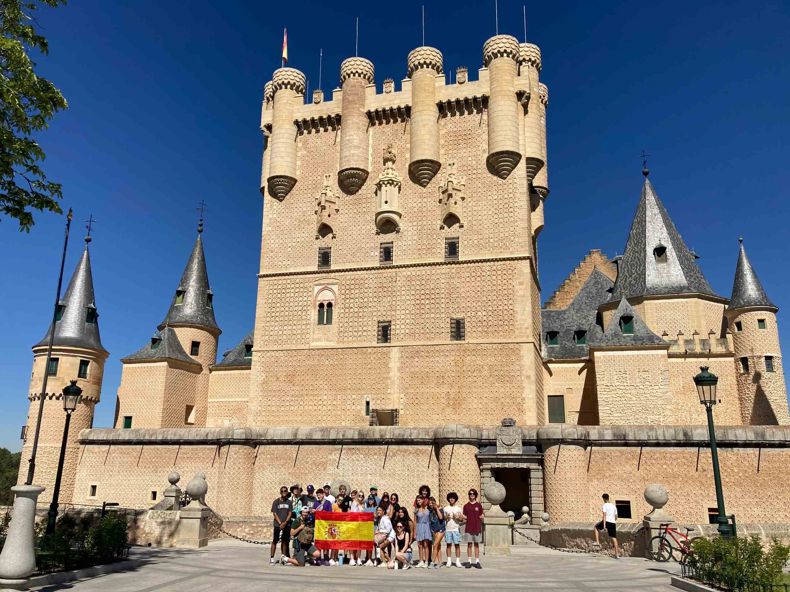 Group of people holding a Spanish flag in front of a historic castle with tall, ornate towers and a clear blue sky.