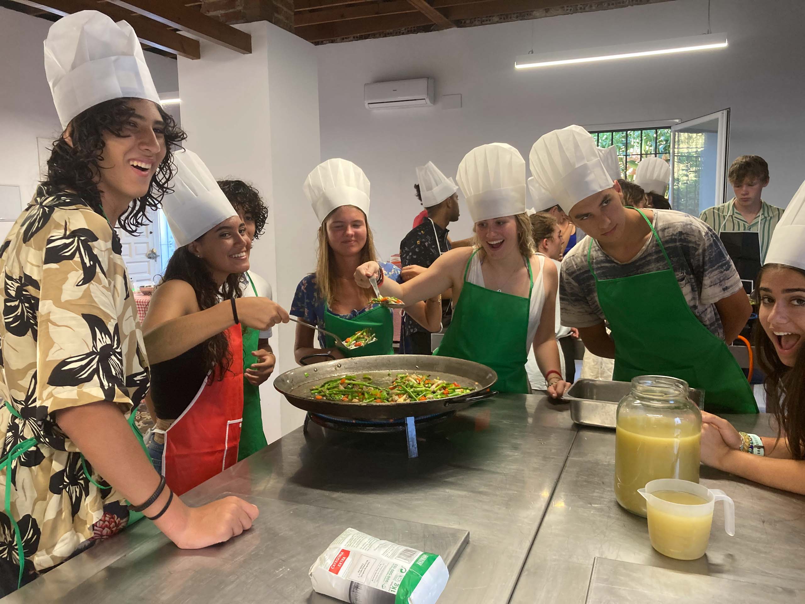 A group of people in chef hats and aprons are cooking together around a large pan in a kitchen.