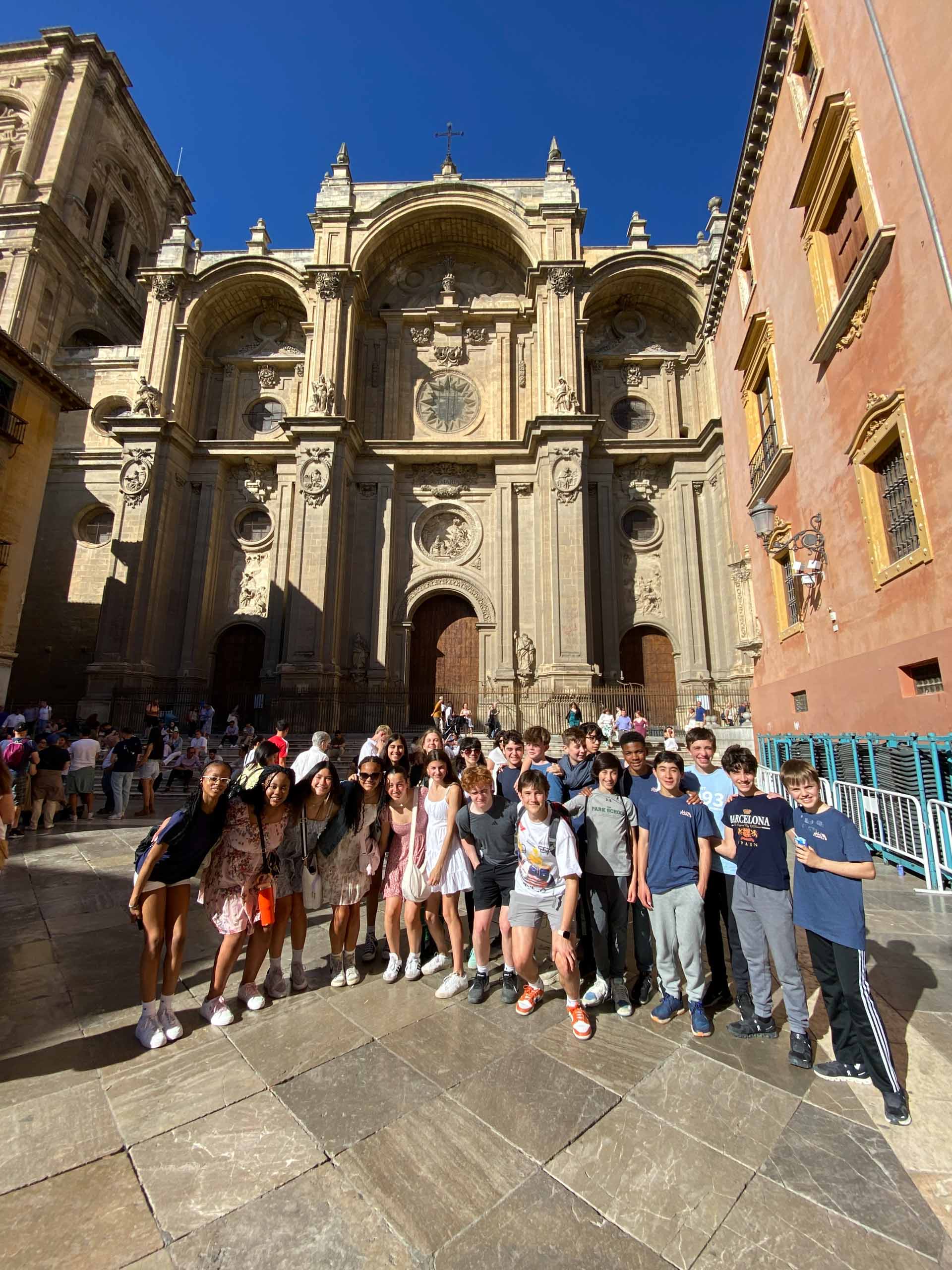 A group of people posing in front of a large, ornate historical building with tall arches and intricate details under a clear blue sky.