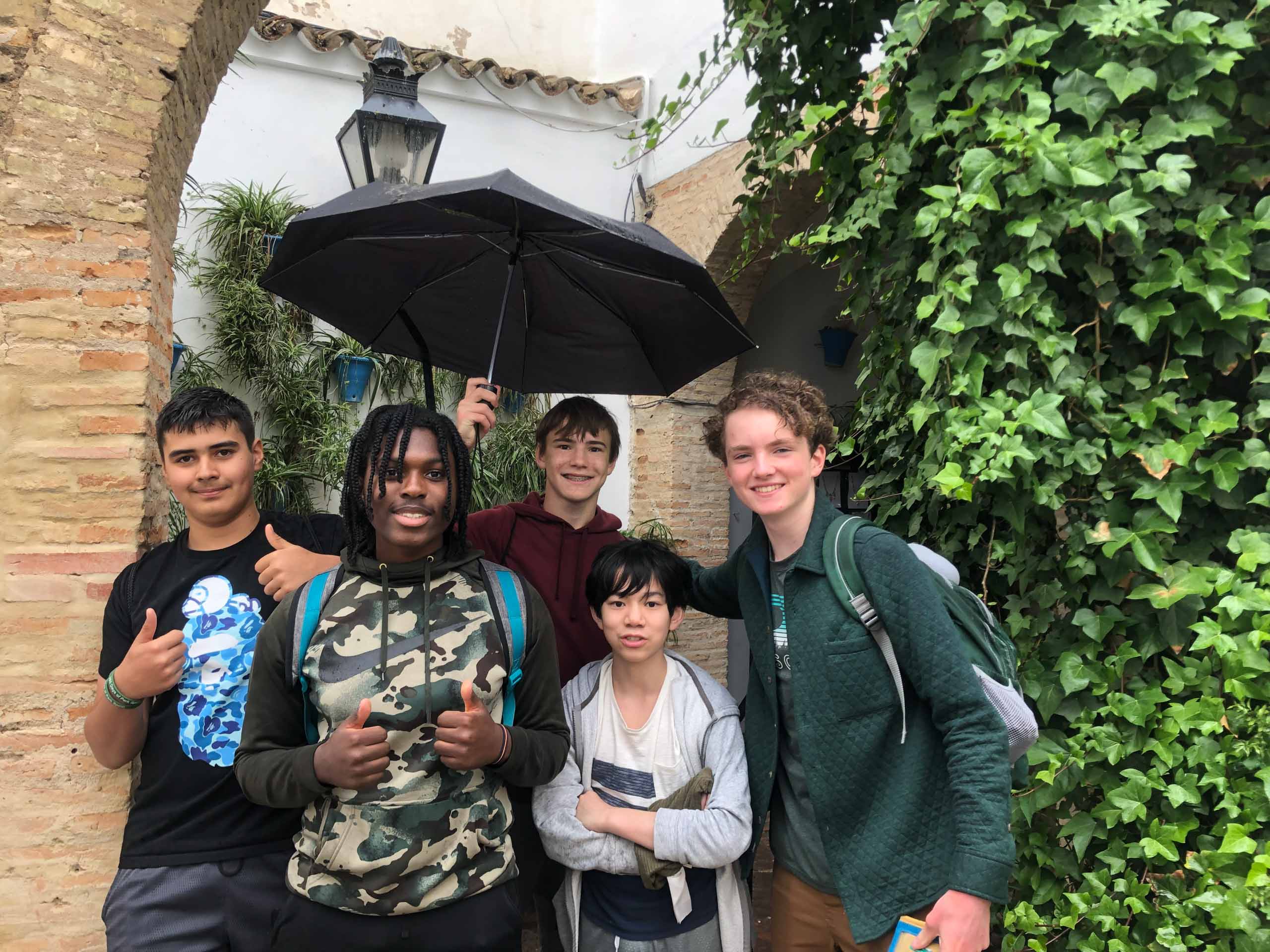 Five people standing in front of a brick archway with greenery. One holds an umbrella. Some are smiling and giving a thumbs up.