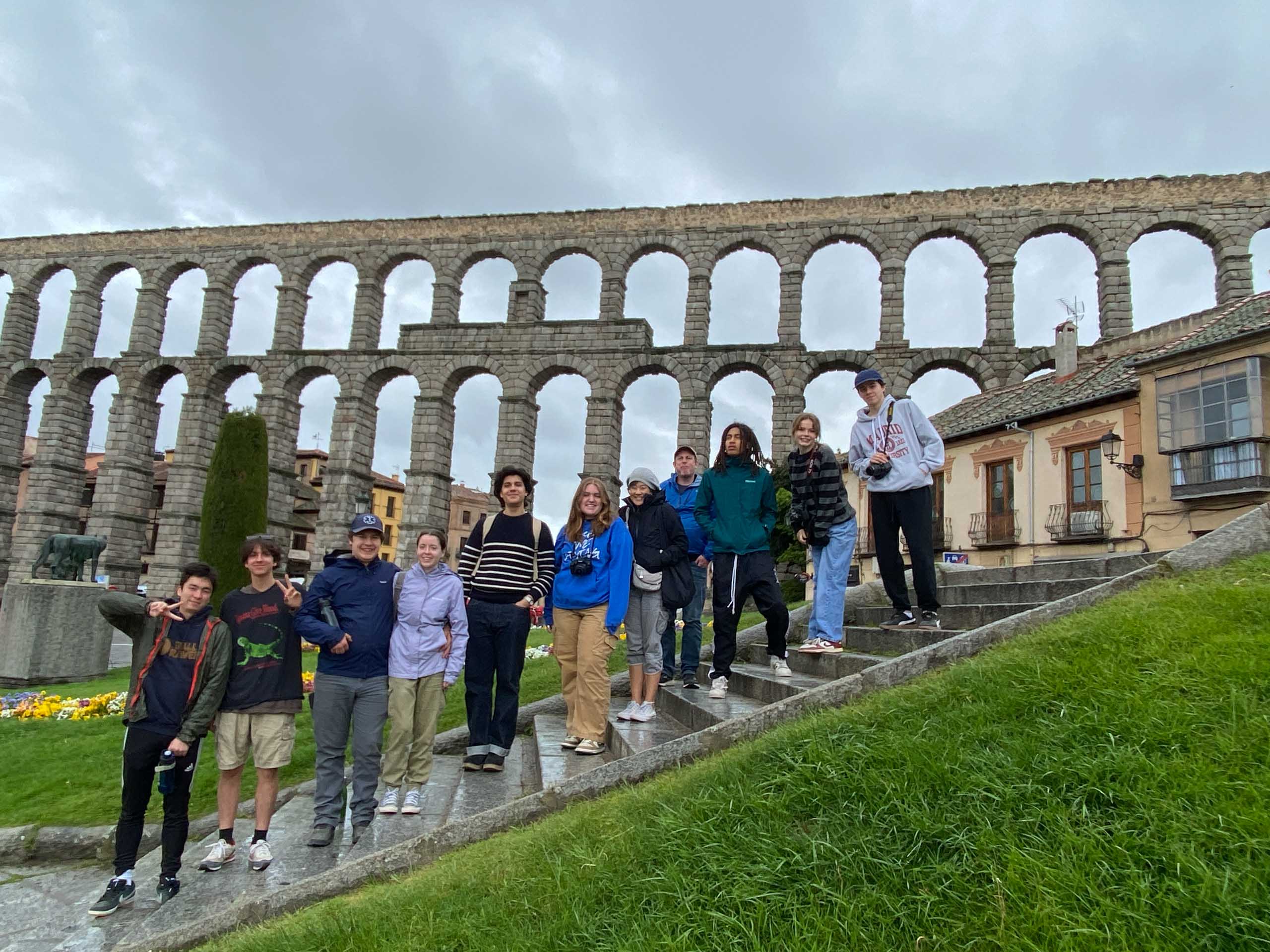 A group of people stands on stone steps in front of an ancient aqueduct, with overcast skies above.