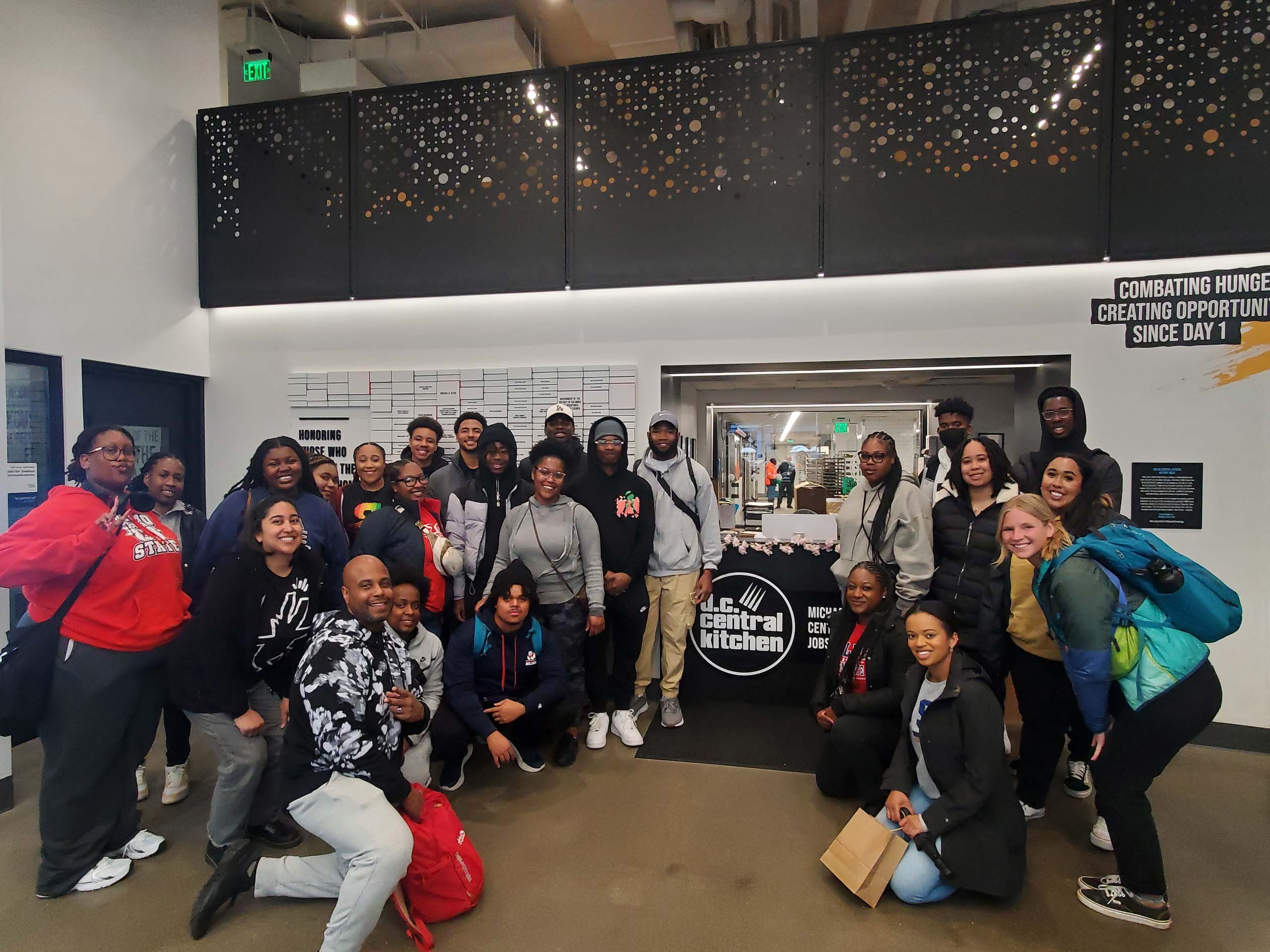 A group of people pose for a photo in front of a Central Kitchen sign inside a building.