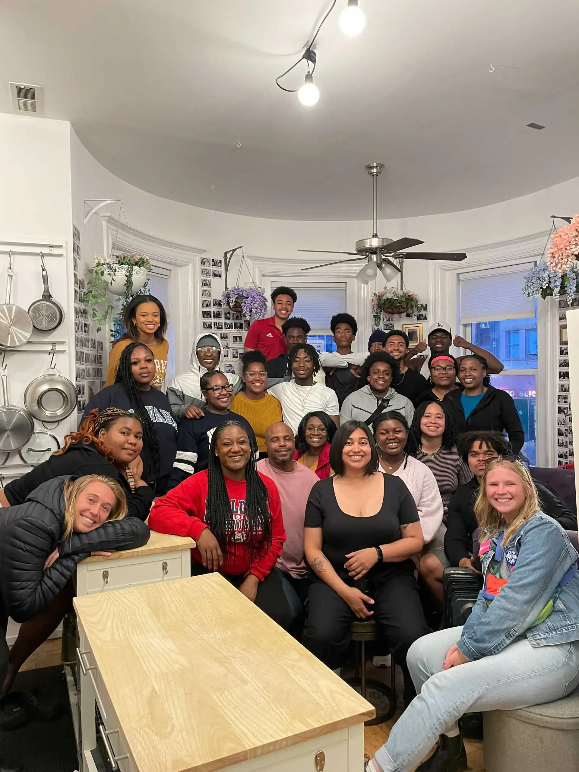 A group of people gathered in a cozy kitchen, smiling at the camera. Pots and pans hang on the wall.