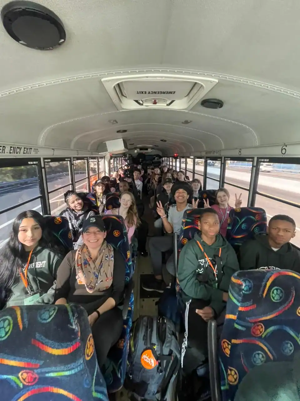 A group of students sit on a school bus, many smiling and some making peace signs, as they travel together during the day.