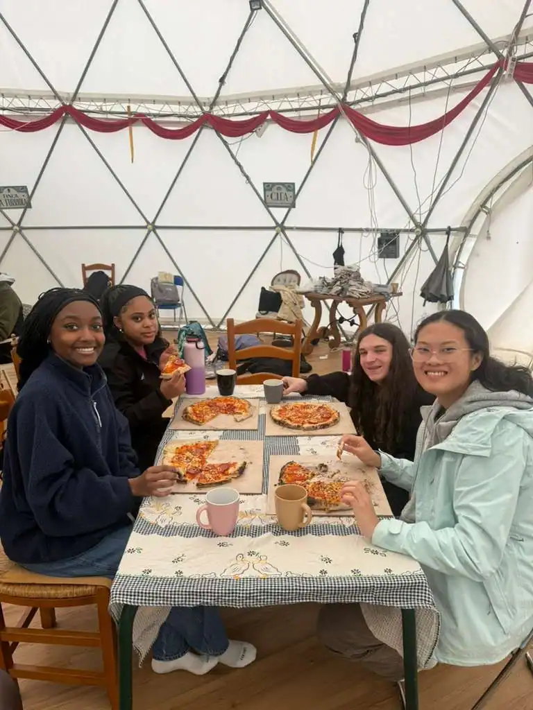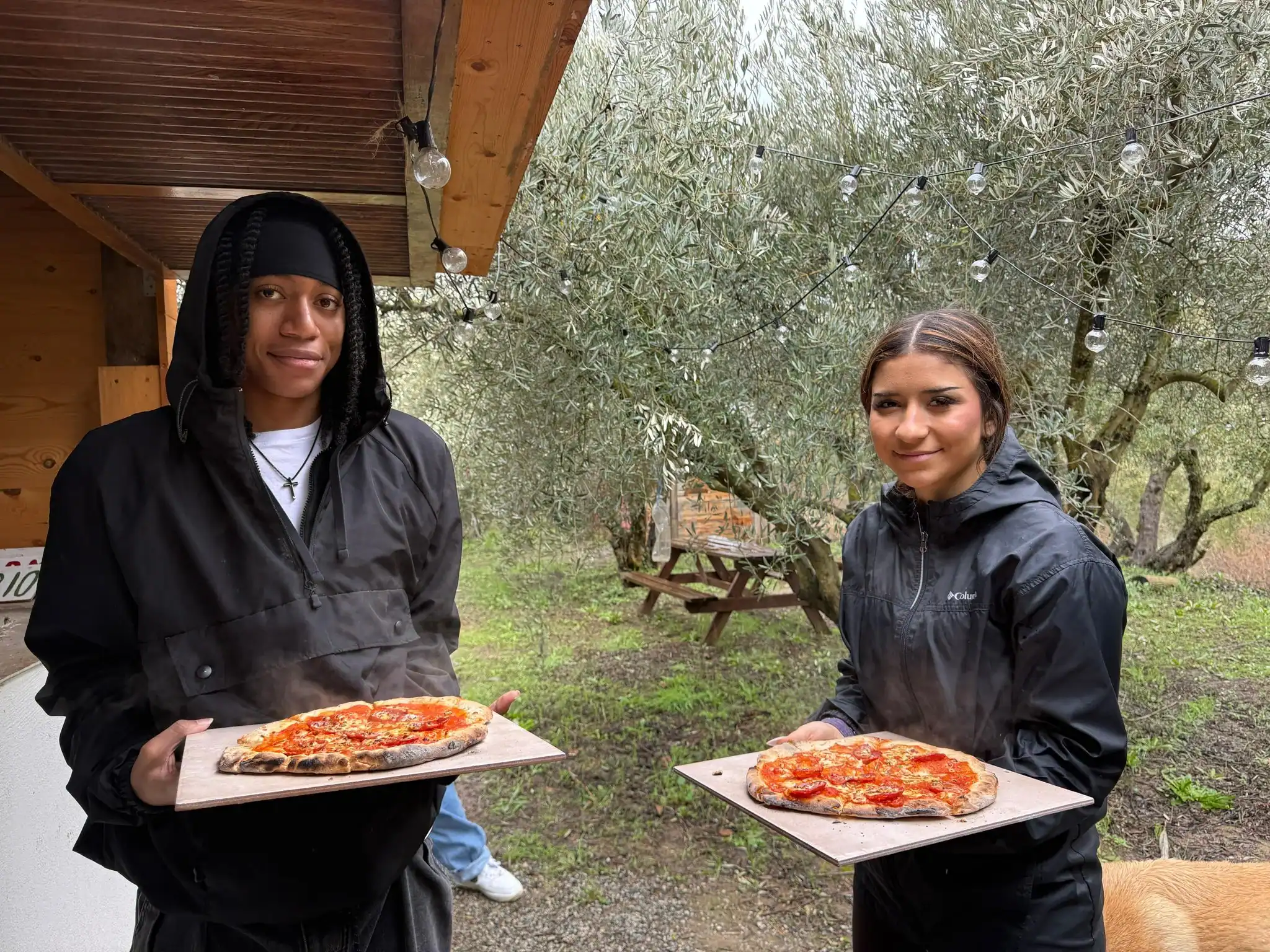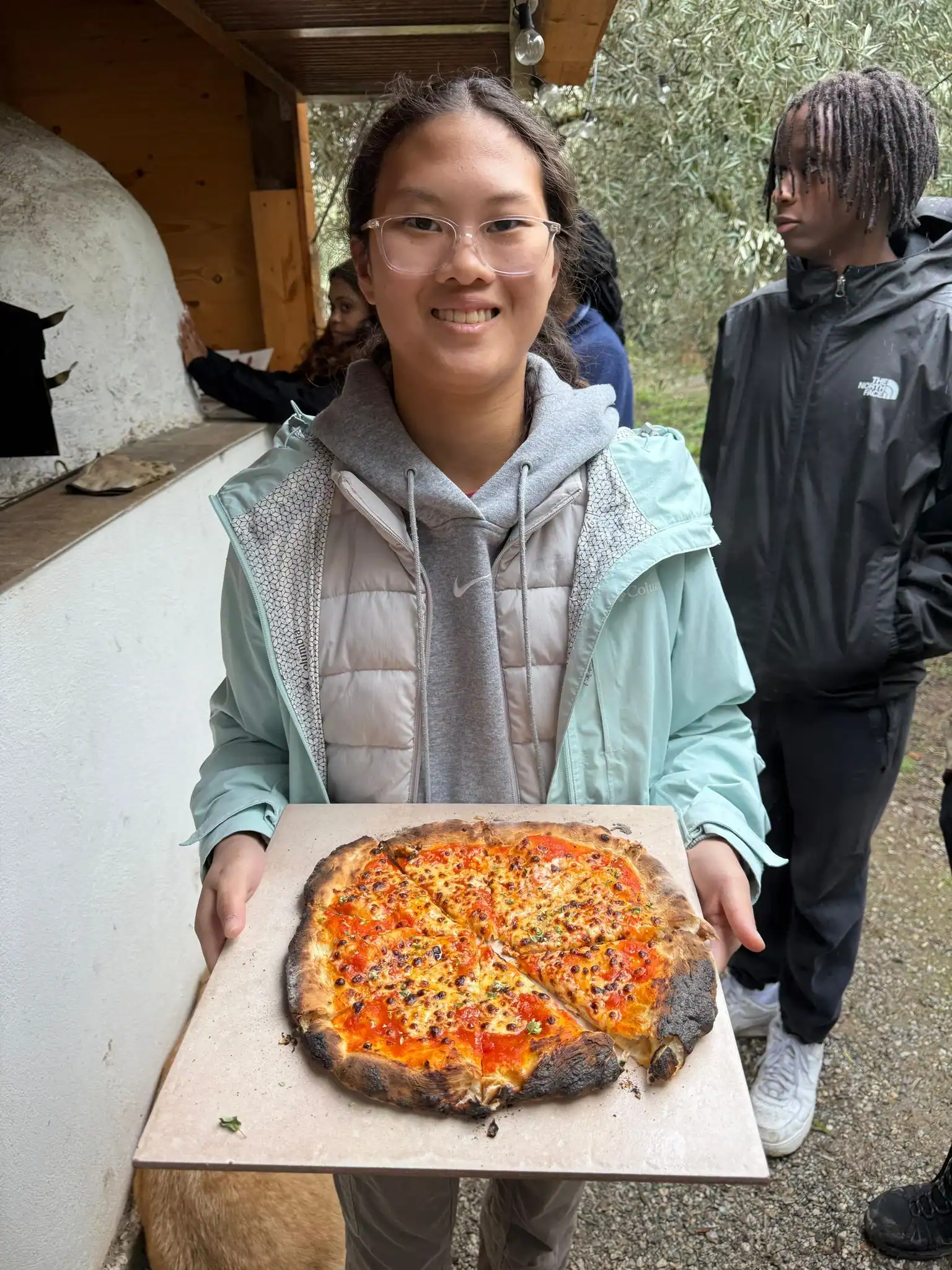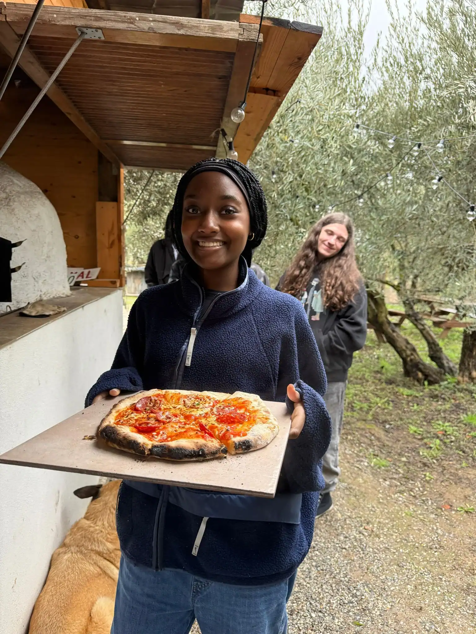We split into three groups to do different activities. Some of us helped in the chicken coop, some planted almond and chestnut trees, and others cut branches to help with the fertilizing process. It was a great hands on experience, despite how dirty and rainy it was, and we enjoyed every moment of it. At lunch, Matteo, who is from Napoli, made pizza for everyone with the ingredients that we chose, which was the best meal we could have had after a long day of work.