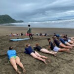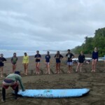 Today the group had breakfast at 8:00, however many of us wanted to explore the area and ran on a trail overlooking the beach for a couple of miles at around 6:30. Breakfast was typical Costa Rican, with rice and beans, waffles, eggs, and fruit. We then had some time to rest and get ready before surfing at 9:00. We walked down to the beach and were met by some very excited instructors. Walking on the beach was magical, as the jungle came right up to the sand, stopping around 50 feet from the water. We went over instructions and did some practice on land with the instructors before hitting the water. The first hour or so was pretty rough, as no one had much previous experience and there was a lot of falling and failed attempts. We had to get out of the water about halfway through due to heavy rain, and had a quick refresher with some water and fresh fruit. After around 10 minutes we went back to surfing. By this point everyone was able to get up and we had a lot of fun surfing for the remaining time until lunch, which was rice, fish sticks, chicken, and salad. We then got some time to chill in our rooms, and it started raining. The group leaders then decided to order us some fried pineapple with ice cream from the hotel, which we ate while watching Cruella and Big Hero 6 in the outside main area.