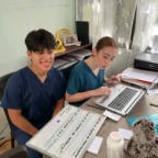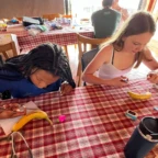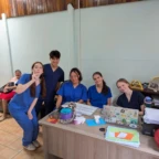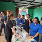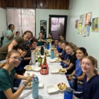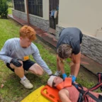 Noon: we’ve been learning some very stressful Doctor stuff. Doctors do not get enough credit! The stressful stuff includes stitches and injections. Meadow locked in on her orange stitches and successfully did it. Abby was struggling with her stitches but Dr. Whitney came through to help. Practicing with injections was easier than I thought. For lunch we walked down the street and enjoyed fajitas, salad, rice and beans. After lunch we had free time and many of us worked on crossroad puzzles, word search, and read books. Before dinner Marcela talked to us about the Costa Rican healthcare system which was super interesting and their system is like 100x better than many countries in the world. We are looking forward to starting clinical rotations tomorrow!!