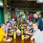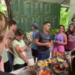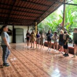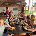 We started the day off with a delicious buffet breakfast of scrambled eggs, toast, rice and beans, and fresh pineapple. We then boarded the bus for a 2 hour ride to the rafting base camp. A wave of emotions filled us all as the rafting adventure began. As we descended the river the nerves went away and we all realized there was nothing to be afraid of. We stopped half way through our journey down the river to climb a 5 foot ledge that we then all took turns jumping off of. As the rafting came to an end, we came to a picnic table that was filled with numerous types of fresh fruit. We then got back on the bus for an hour and a half ride to our lunch spot, where we were met by an amazing meal of chicken, rice, beans, etc. with the company of playful monkeys. We all took tons of photos along with watching them eat bananas and swing from tree to tree. After lunch we were all exhausted, so some of us took a nap on the sort bus ride to our new hotel. When we reached the hotel, we are split into 6 groups of 3 to share our cabins. We had a few hours of free time before dinner where most of us enjoyed relaxing in the beautiful pool. Dinner was served delightfully along with a gorgeous sunset and a family of ducks and chickens. For dinner we had chicken rice salad and fresh mango juice. After dinner we all had a beginning of our trip orientation, where we played fun games and got to know one another. To end this tiring day, everyone went to play and relax before going to bed.