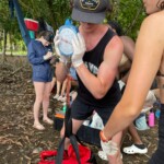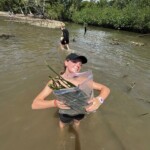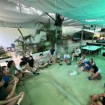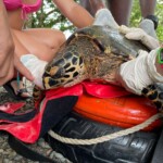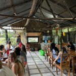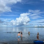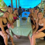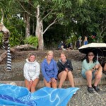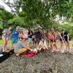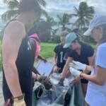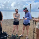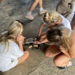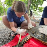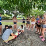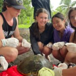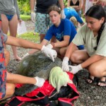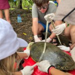 Before we could even relax, we’d already caught our second turtle. This one was a hawksbill, the ones which are harvested for tortoiseshell material. This one was measured by Pauline, our Gabby, Meredith, and Evie, while Ayla wrote down the results. This turtle was finished much faster than the first, as we had already gotten the basics figured out. While this was going on, a small group of people, including me (Max), broke off and began swimming. After the second turtle was done, most of us began swimming, but then we were told to return to shore by Luke so we could help take things out of the boat to shore. It began to rain, and it only rained harder as time went on. While this happened, we huddled under a tree, but we were told that the ocean would be warmer. All of us jumped into the water and were soon met with a tumultuous belt of waves. It was hard to see, but the rain soon died down, we went back to the hotel, our last task was to untangle and box up the nets we used so we can use them again tomorrow, we had some free time, played volleyball, had dinner and went to sleep, waking up to the second day of sea turtles!