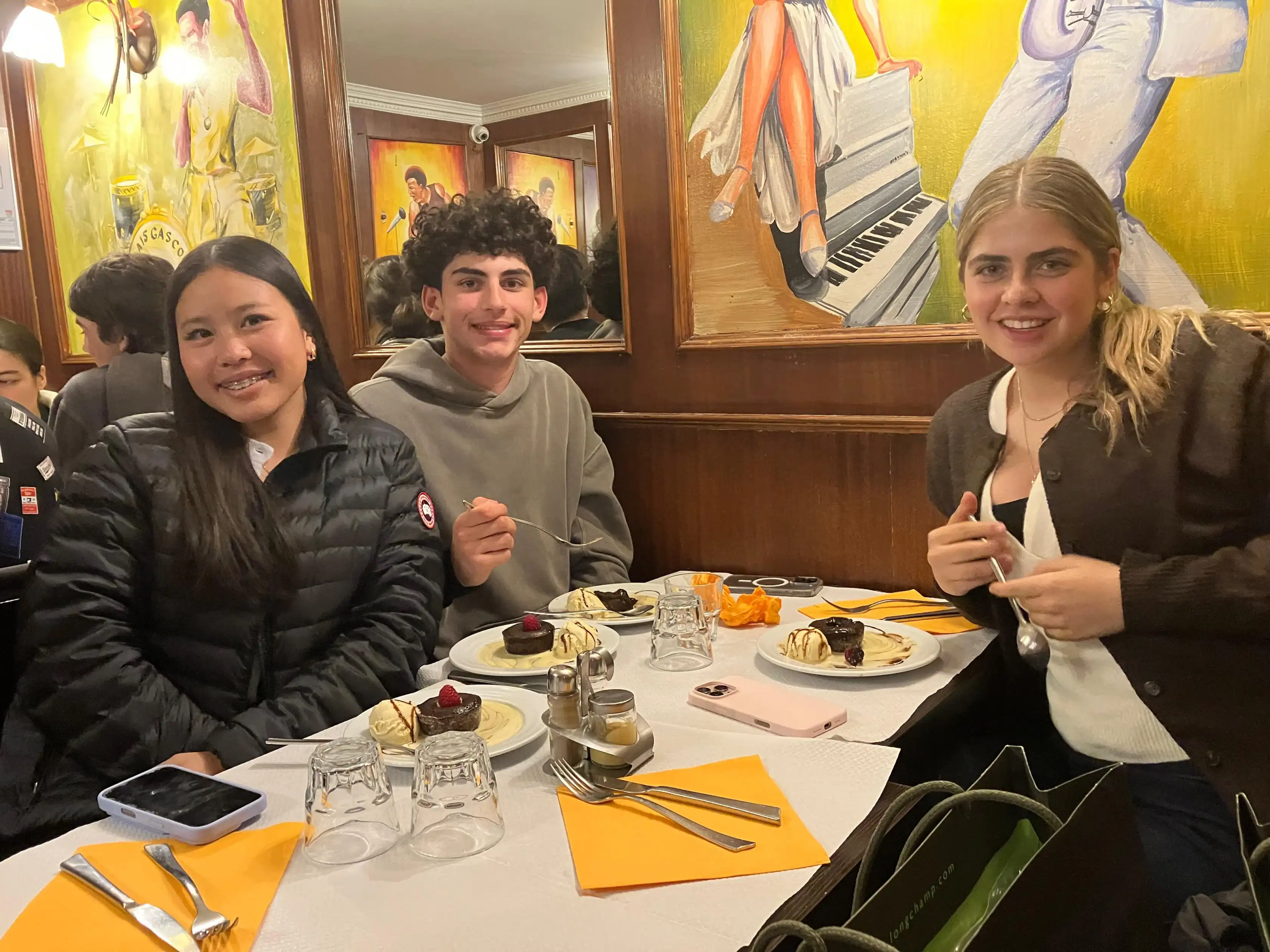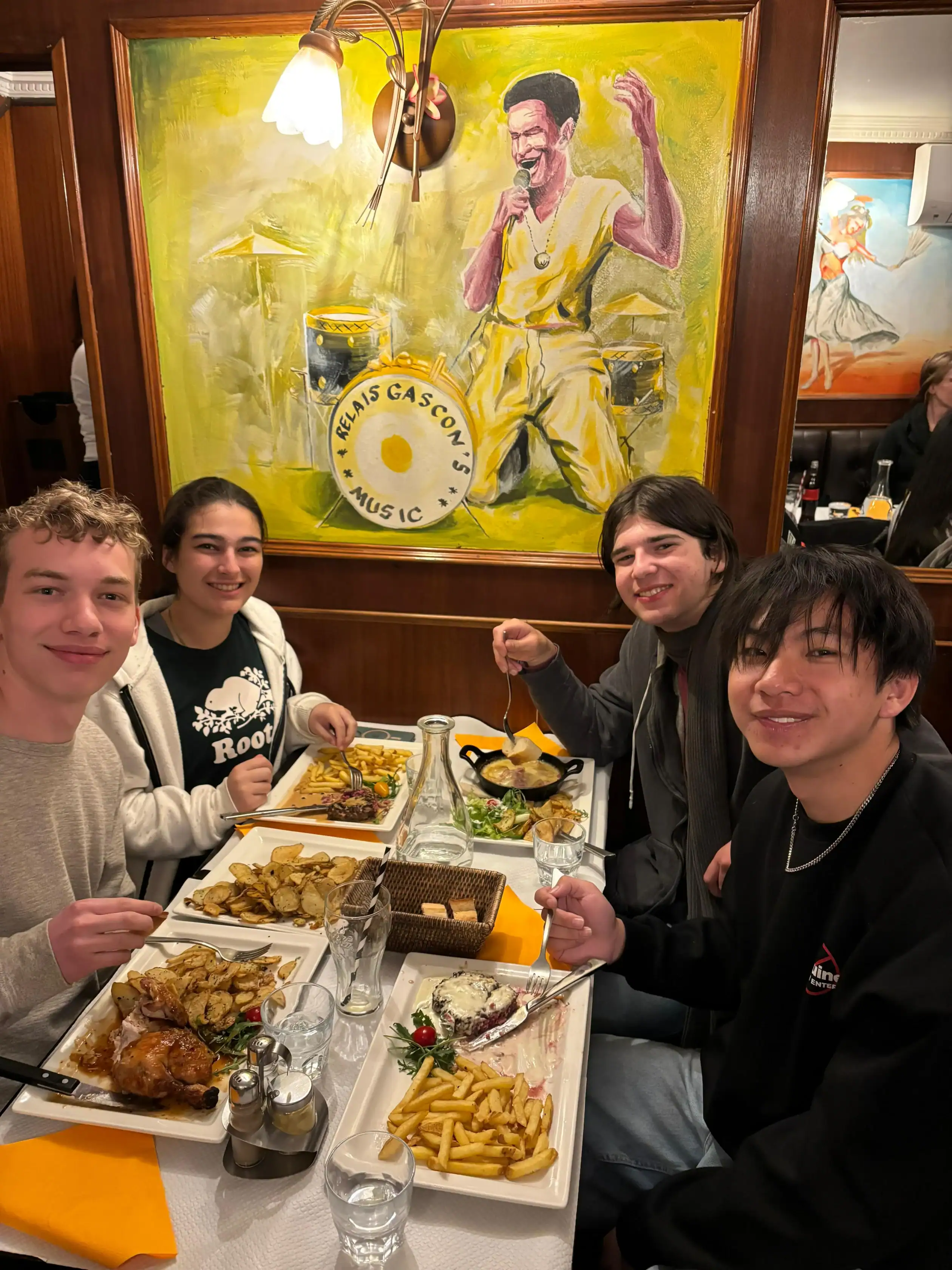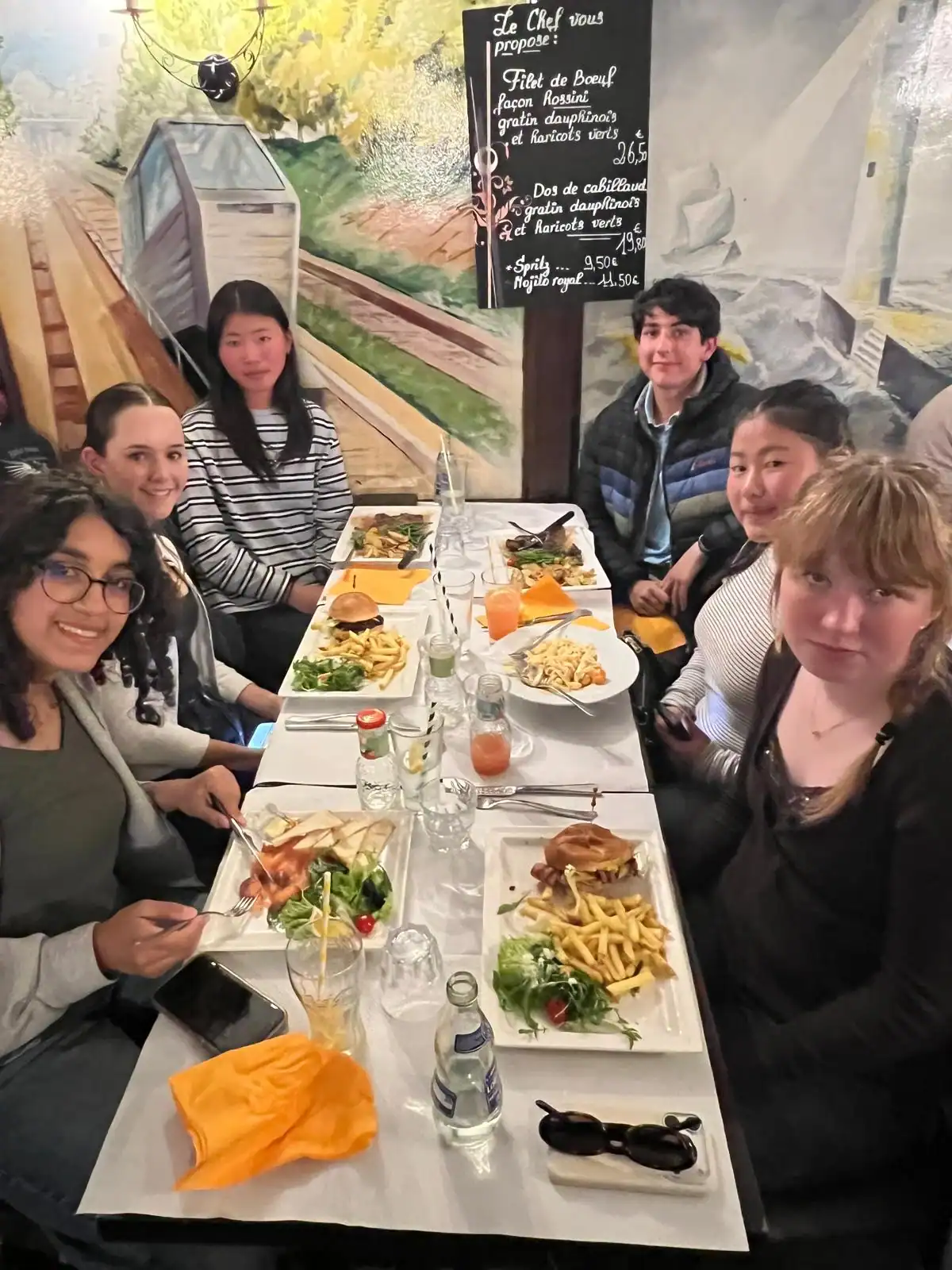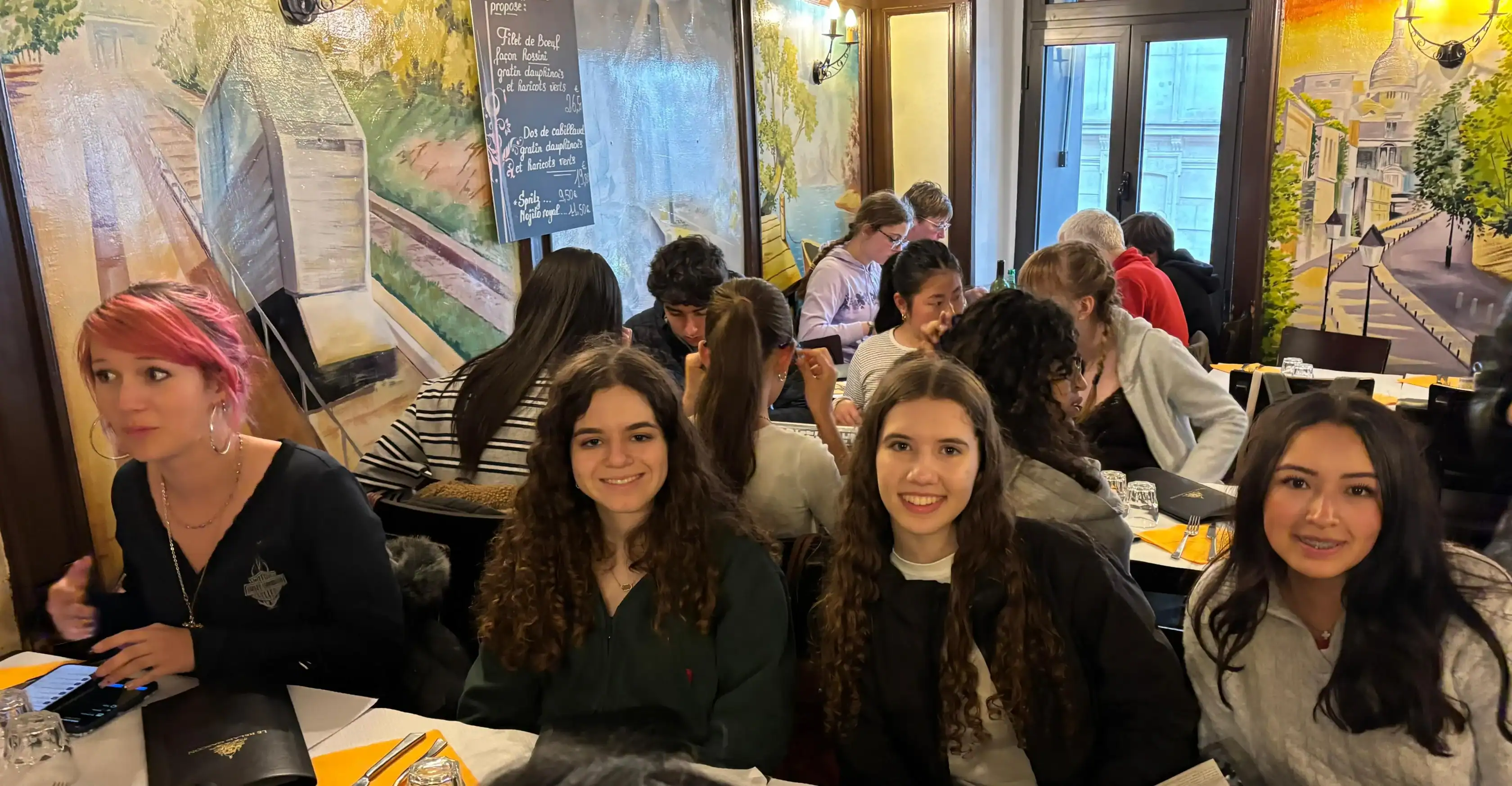 On Friday afternoon, we boarded our AirFrance flight to Paris. For dinner, they served chicken, rice, bread, and chocolate cake. Très délicieux! When we arrived in Paris, we took the bus to our hotel and ate a delicious lunch buffet. We enjoyed some bread, pain au chocolat, and of course, croissants. After lunch, we took the bus to the Musée d’Orsay, where we looked at everything from sculptures to impressionist paintings—including paintings by Monet and Van Gogh. Then, we went back to the hotel and had some free time, during which some of us went shopping and some others played games. To end the night, we went to a delicious crêpe restaurant where we ate savory and sweet crêpes. À demain!