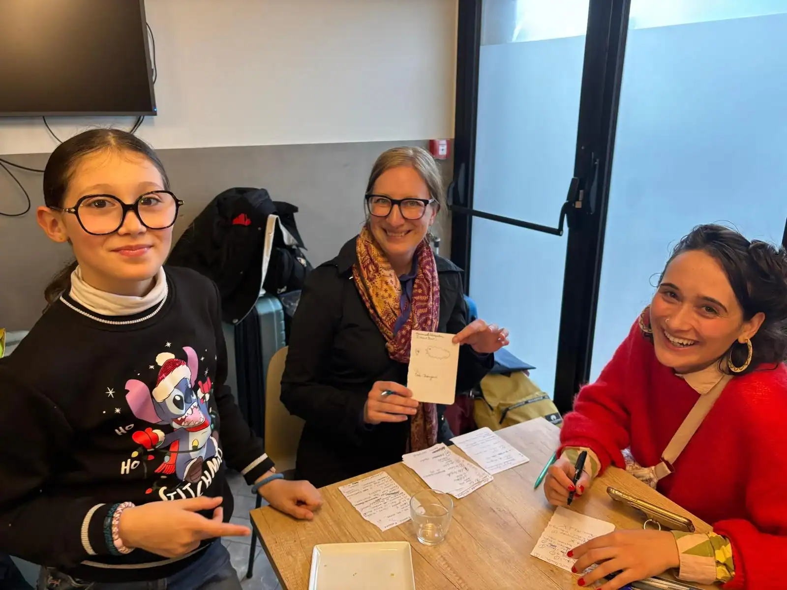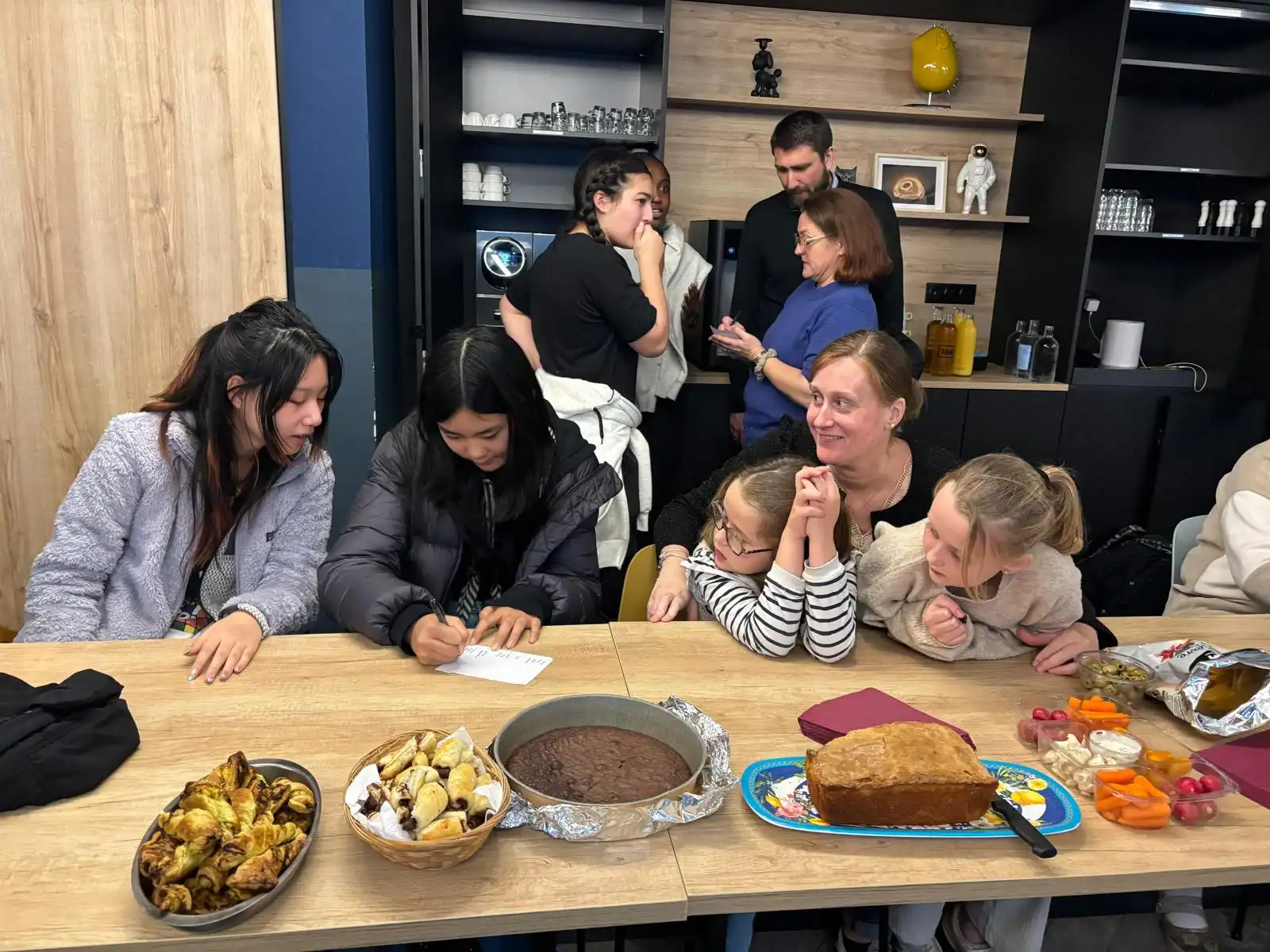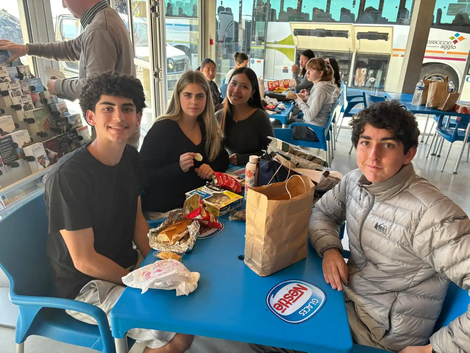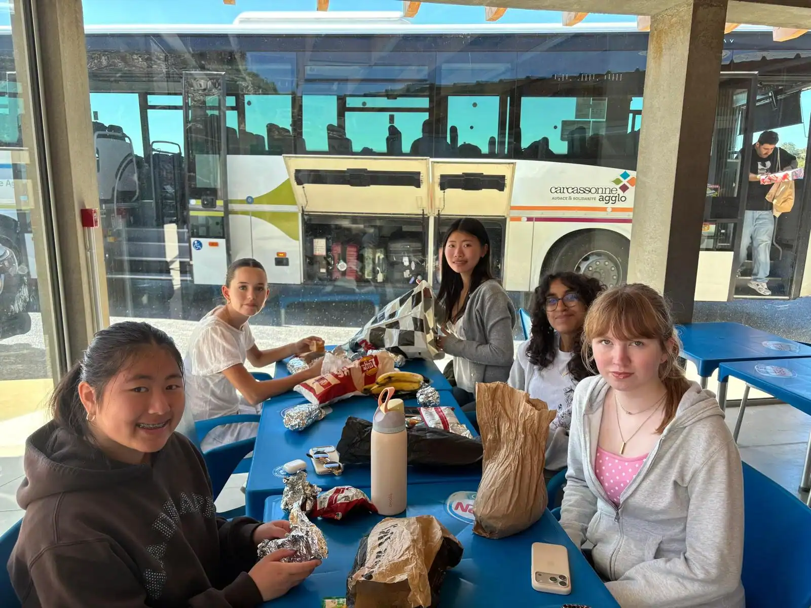 We then walked to our bus, and took a 3 hour bus ride to Carcassonne to go meet our host families! We mainly slept or watched movies on the bus. When we finally arrived, it was raining really hard and we had to rush to our hotel with our luggage. In the hotel, there was a potluck and our individual groups were able to meet the host families. We all shared food our families brought while playing trivia. There was a tie, and the tiebreaker was guessing french and american songs. After that, we all individually drove to our host families houses, got a house tour, and ate dinner together while asking questions and getting to know more about each other. The night ended with us playing games and hanging out together with our new families as we went to bed. À bientôt!