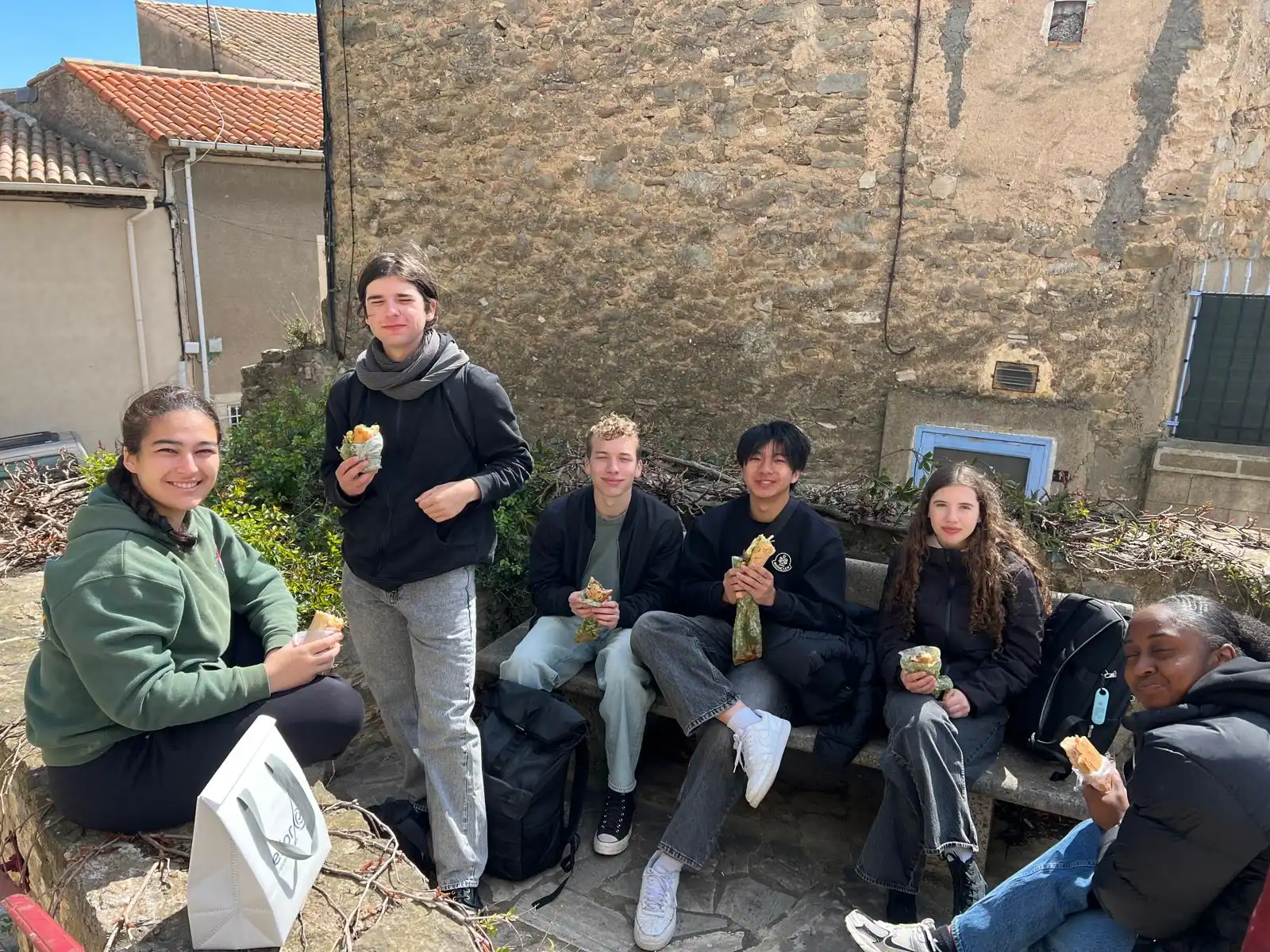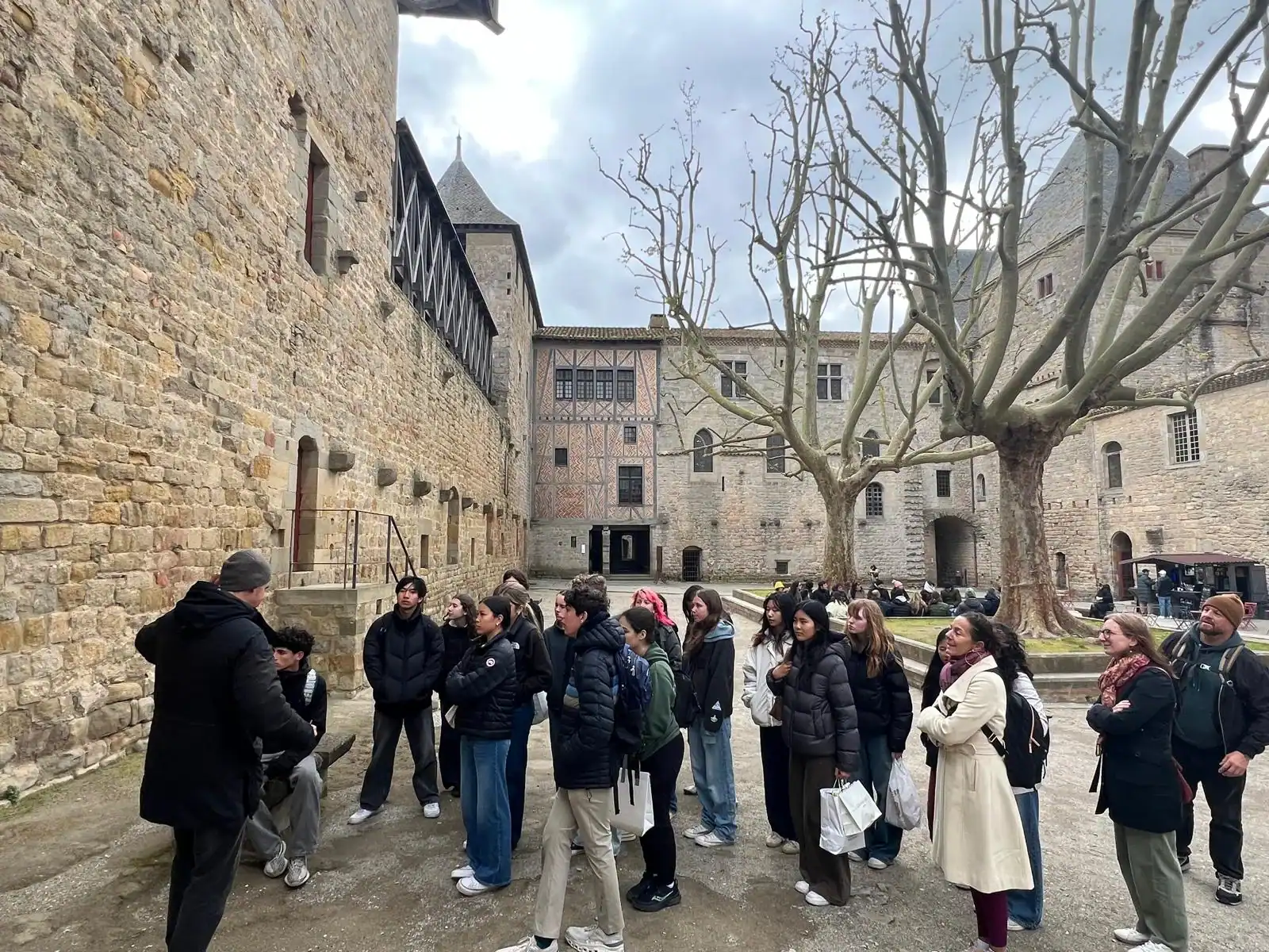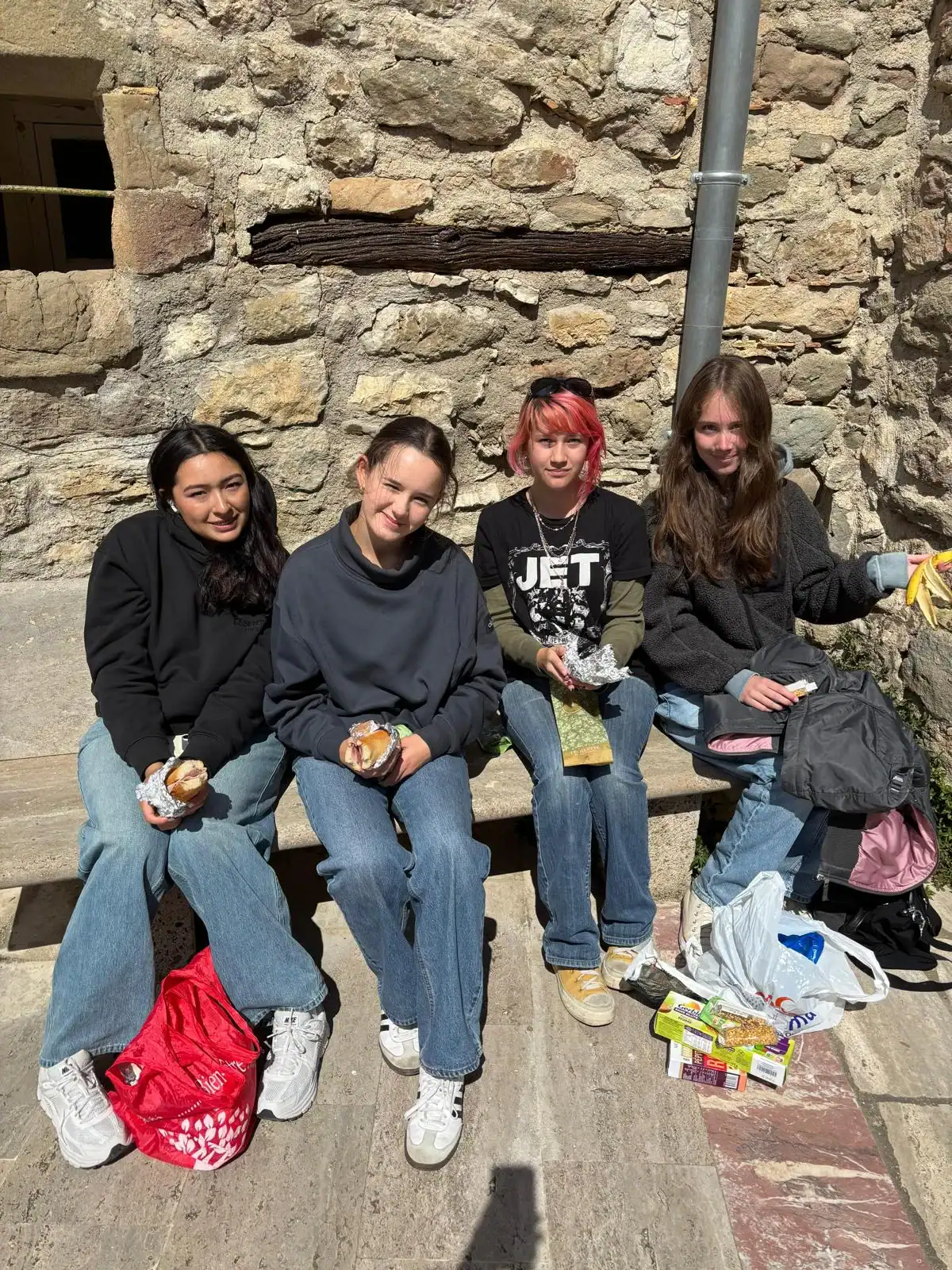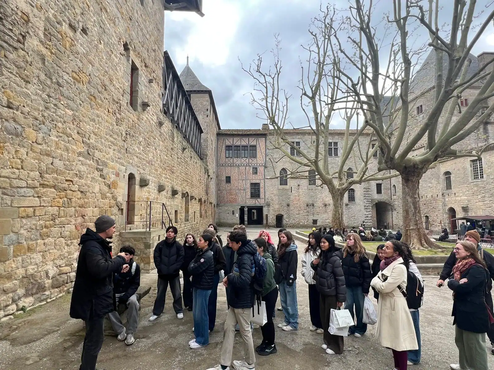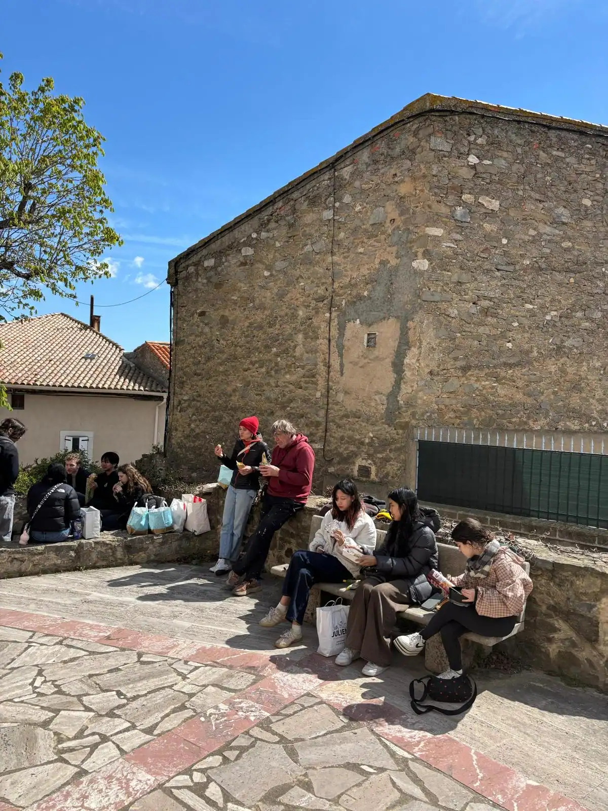 Today we visited a middle school in Carcasonne. The school day consisted of attending different classes that included French, English, Latin, History, Spanish and Math. In history class we learned about 9/11 and Picasso’s art during the Korean war. In English, we were interviewed by the French students and every few minutes we switch tables to meet new kids. It was like an interview circuit. In Latin, we learned about the Greek and Roman gods, their symbols, and what they are the god of. We had chicken, rice and yogurt for lunch in the cafeteria where we ate with the middle schoolers. All of them loved saying 67 and they also stared at us a lot. They played the national anthem every time there was supposed to be a bell to switch classes and there was a welcome sign with the American flag and the Statue of Liberty on a TV screen. Afterwards, we went to La Bastide the city center and got small pastries and had some shopping time to buy souvenirs and look at the different boutiques and different stores. After, La Bastide we walked to La Cité and met up with our host families and went home with them.