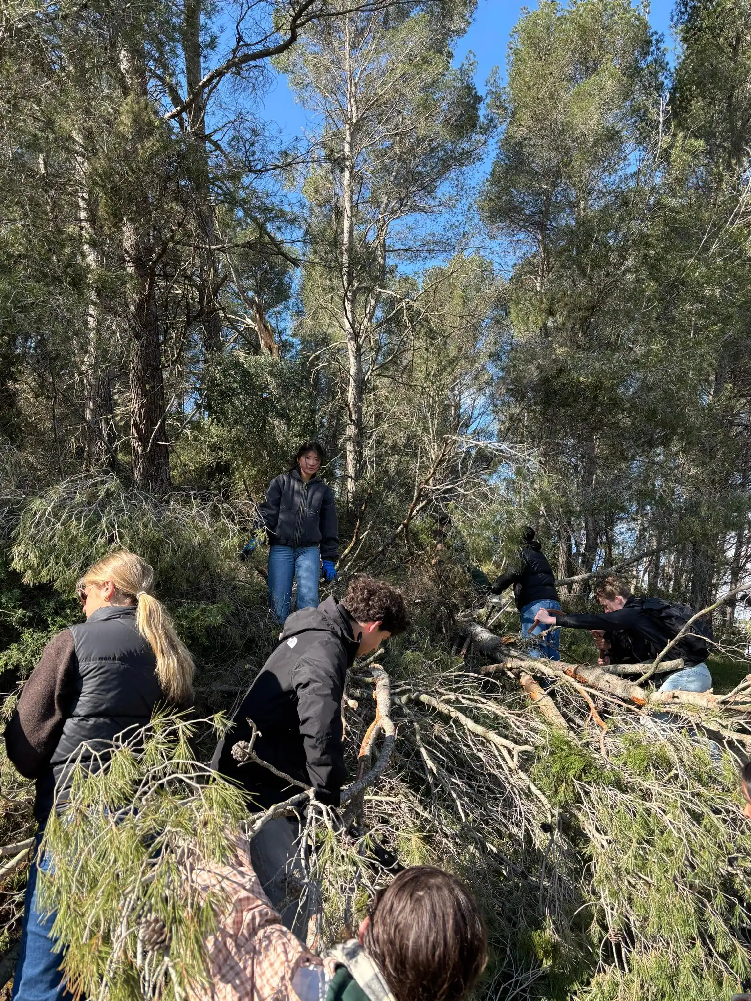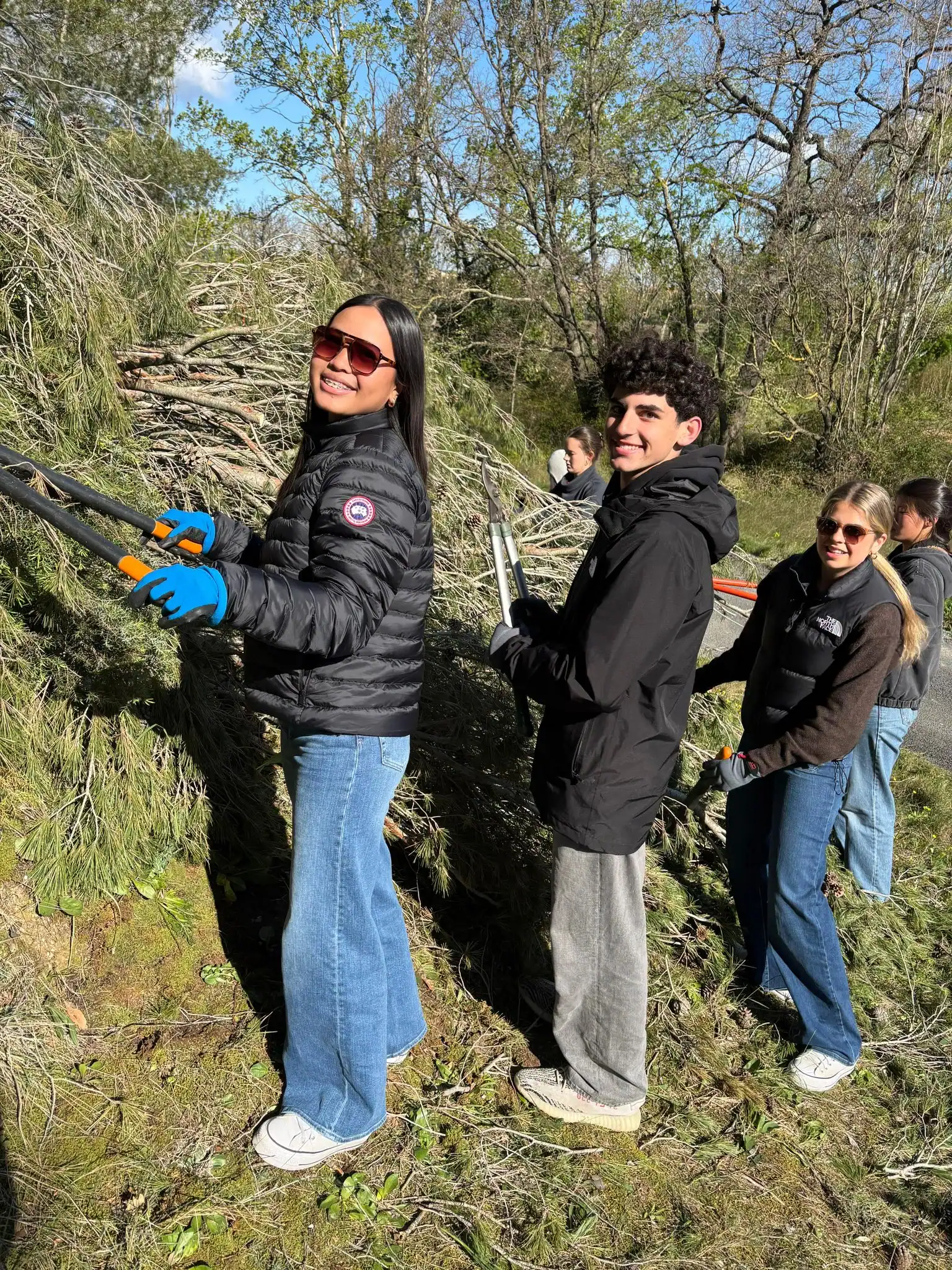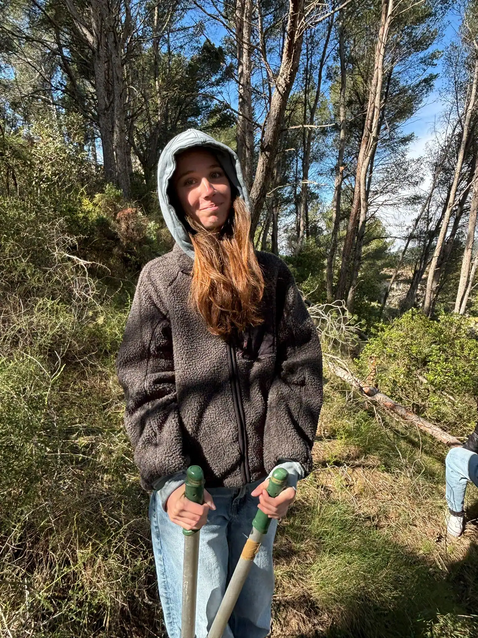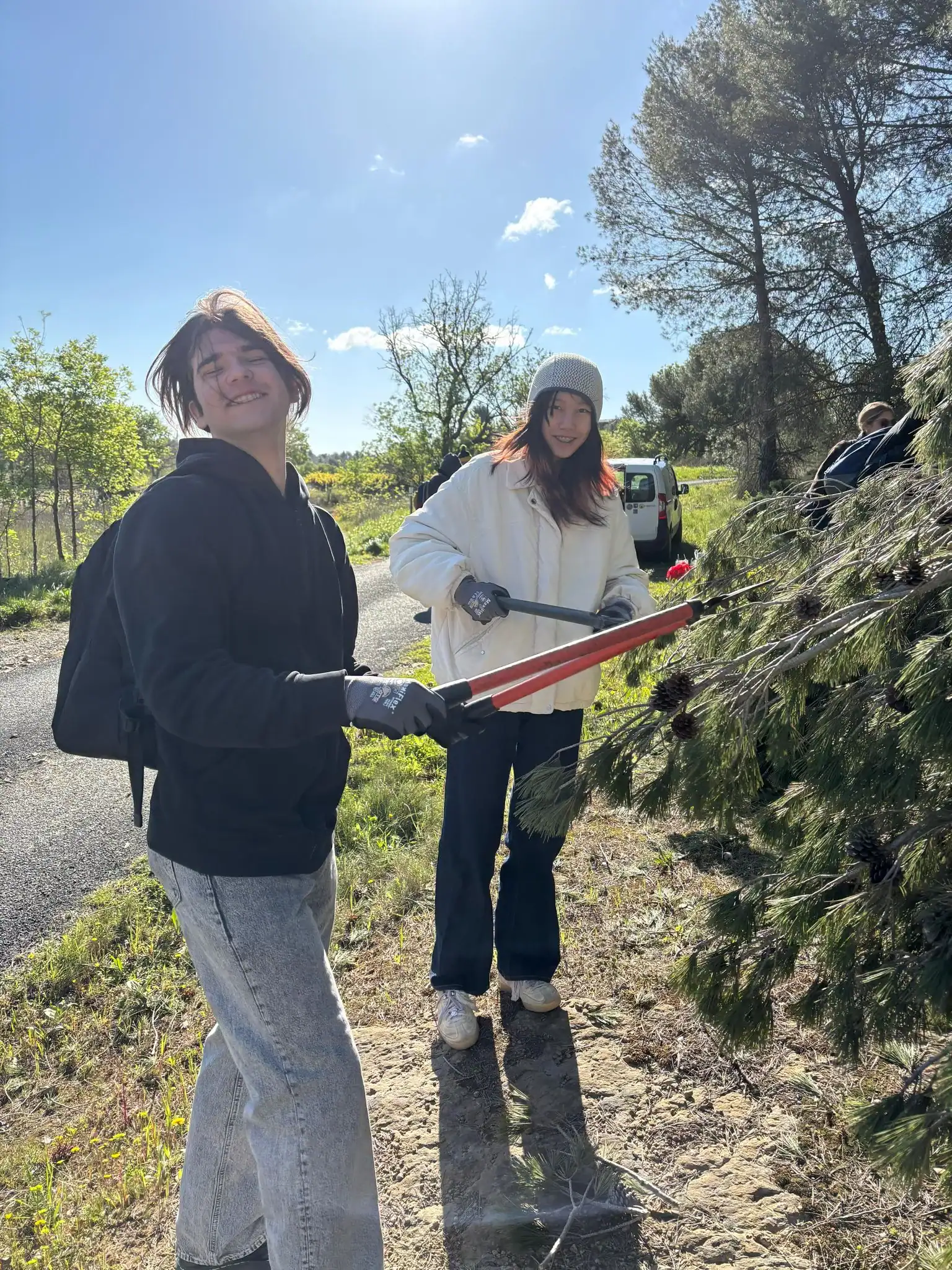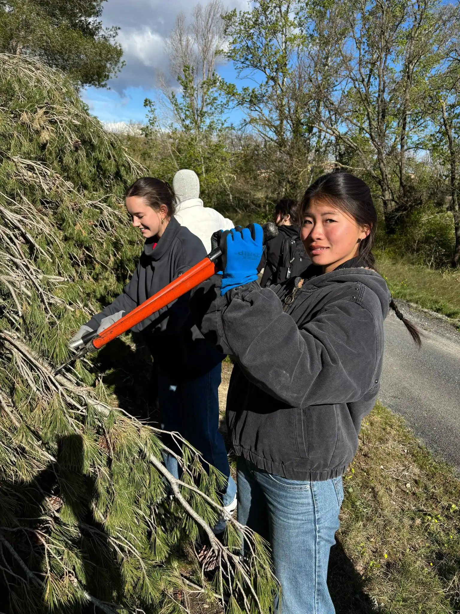 Today, we woke up in our host families homes after spending our first night with them. We enjoyed a nice breakfast with our families before saying goodbye to do some community service work! We went to the Chemin du Compostelle where we did some trail maintenance. We cut up felled trees using saws and pruners and put the branches into a large pile for removal. We worked very hard and did even more than we were supposed to because we got so into the project. Then, we went to La Cité, which is an incredibly preserved castle from the middle ages. There can be found mosaics from the ancient Romans, and crepes from the French! After our journey through time, we enjoyed a dinner made by our host families. Yummy! We miss our real families very much.