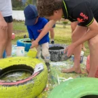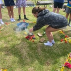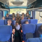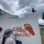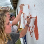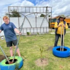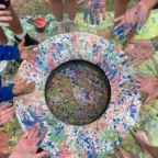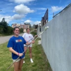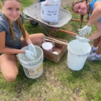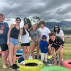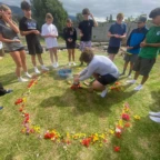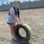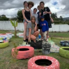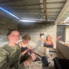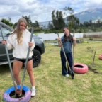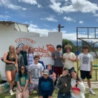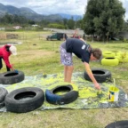 Once we arrived, we rolled tires down the hill (carrying was harder) and painted more tires and the walls, while Roen laid down concrete at the workbench. Margaux, Mac, Charlotte, and Isabelle painted a mural on the outside wall. Everyone pitched in to dig holes and plant flowers inside the tires. Afterwards we stopped for lunch to have soup, chicken, and pineapple juice.