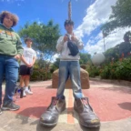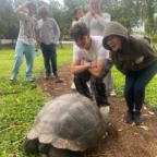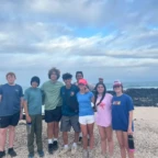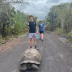 Hola! We have returned to Santa Cruz Island! We made it this morning after a bumpy boat ride back that caused some of us to lose our dinners. We then strolled to breakfast and tried an Ecuadorian dish called bolón verde, made of plantains, cheese, and seafood sauce. Then we made it back to our hotel that we were at earlier in our journey. Everyone crashed on their beds to later go to lunch. We walked to a local restaurant and had the option to eat tuna and rice or a chicken paella. We quickly stopped by the hotel to change into our suits and get on the bus. At the end of the bus ride we learned we had a mile long walk to the iconic beach of Tortuga Bay! But we were running out of time. Once we finally made it to the beach we got told that we could only be there for 5 minutes because the park was closing. Thankfully we were able to be there for longer than that but due to a bit of miscommunication with the local guide, we ended up heading back soon, but not before leaving our mark. We ended up writing in the sand and admiring the view; Some of us even saw a small shark at the edge of the water. After we made it back off the trail, the bus took us back to the hotel. We were bummed we couldn’t swim cause of rip tides in the area, but we still enjoyed the lukewarm tub and pool. Ending the night with a delicious dinner at the hotel, pool games, and an ice cream run.