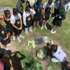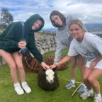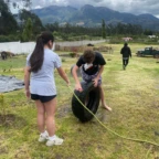 Today was our final day in La Calera. We started the day by having breakfast at our homes with our families. Then we all made our way to the comedor and quickly got started on making a traditional meal called Pachamanca We all put on our Rupay Restaurant matching aprons and hats and got to work. Everyone worked together making it, some of us cut up veggies for a delicious salsa, wrapped veggies, fruits and meats in cabbage and different kinds of big leaves, husking corn, everyone doing their part to make this amazing meal. Once we finished preparing we started putting the food in a deep hole lined with large leaves and used very hot rocks from the fire to layer into the food so it would cook. Once it was filled we made a barrier of stone bricks and leaves to protect the food from the dirt that goes on top.