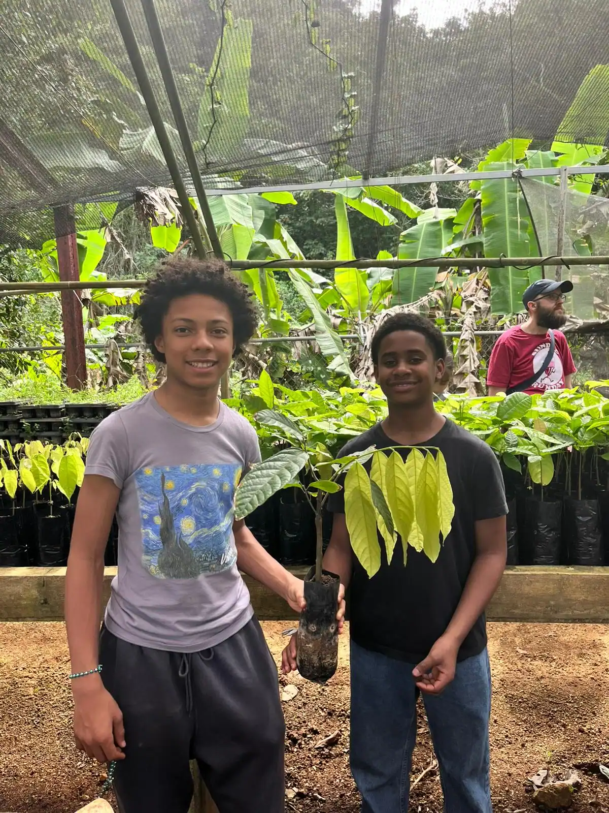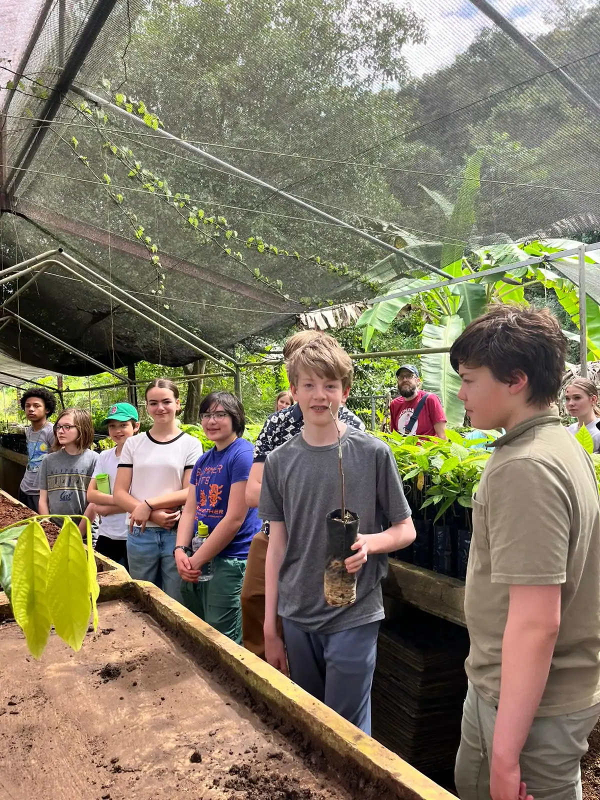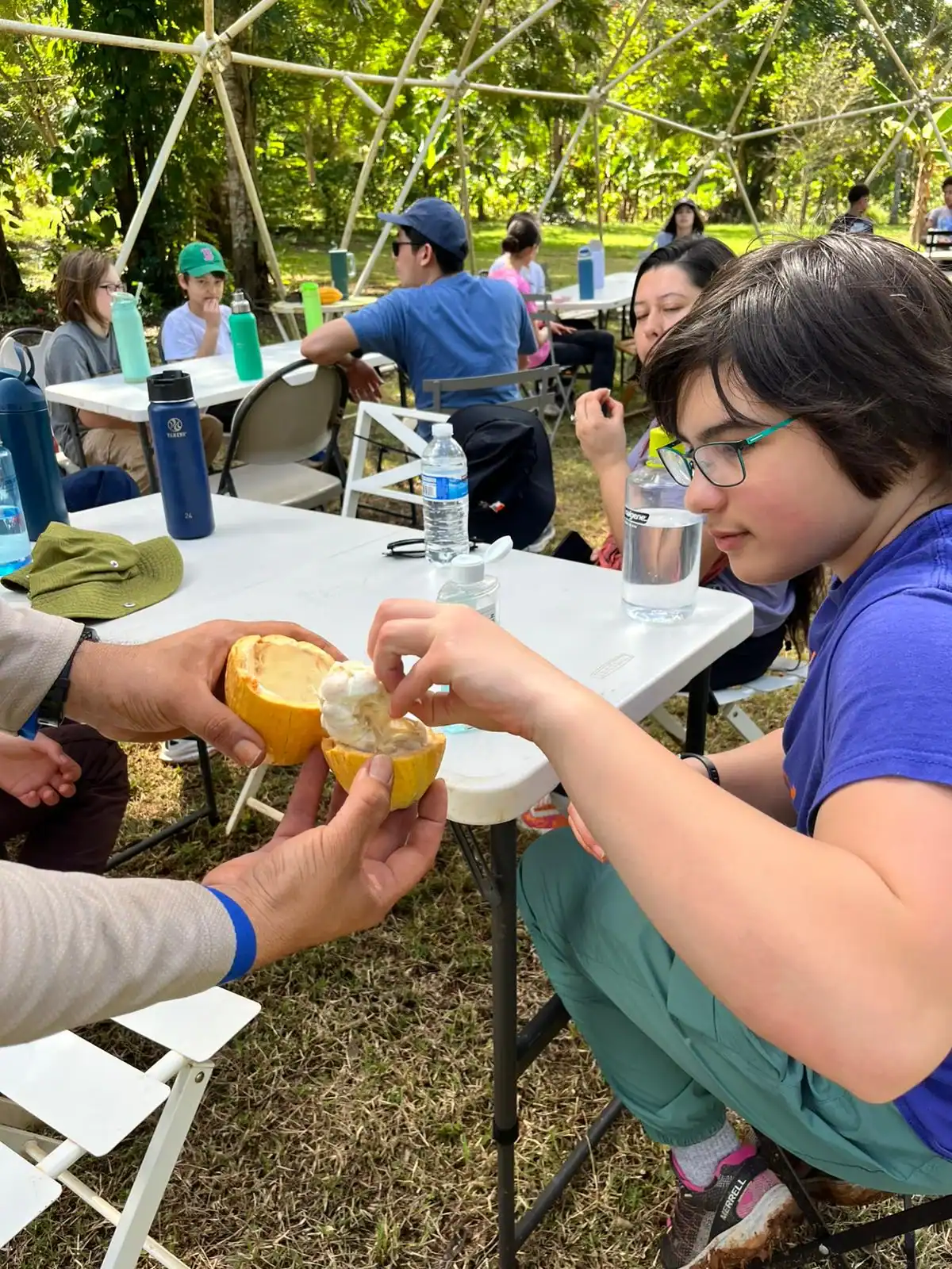 At 8am, we bussed to Finca Semila for a morning of service on the farm. We split into four groups where we engaged in various projects: planting peas, bagging dirt, helping create a wall of plantain trees and moving chairs for the afternoon lunch. After this, we learned about how cacao beans are grown and processed before trying some of the farm’s finished chocolate. We also took a tour of the greenhouse where we learned about the process of grafting a cacao twig to a seedling in order to maintain genetics and expedite the process of bearing fruit.