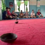 The camera follows Ian as he enters a large building filled with others sitting cross-legged. He drops to the same position, as someone offscreen mutters some Fijian verses. A coconut filled with a whitish liquid slides to Ian’s feet, which he quickly drinks.