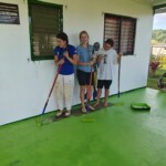 Bula! We arose to the small pitter patter of the chickens talons across the tile and the refreshing moist dew on each blade of grass. We scarf down yet another doughnut and scone breakfast before heading back to the kindergarten for service. Fiji time hit us hard in the morning as we waited for Jim filling our time with bracelets and for some sleep. As Tyson single handedly and heroically moved tons of gravel and cement to help renovate the local kindergarten. Keep in mind us girls were hard at work addressing the possible asmr video potential of our cement mixing. Kevin eventually decided to awake from his slumber and help us with our service where we then had fresh coconut water and meat straight from the tree. As we take our well deserved coconut break we mosey over to the community hall for our lengthy lunch break where we are reunited with our favorite feline friend. As we head back to the school our favorite activity takes place (painting) however unfortunately more paint ended up on skin then walls. We then wrapped up our day with a quick dip in the river with the locals, a game of cards, and another delicious dinner. We are optimistic for a productive work day tomorrow.