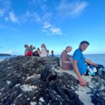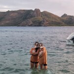 Camera starts with high aerial view of the Fijian beach. Seagulls squawk in the distance as it slowly zooms into a large boulder on the shoreline, as a small group of teenagers finish a climb to the top.