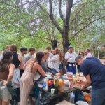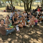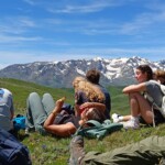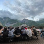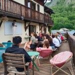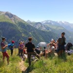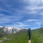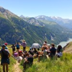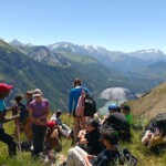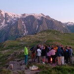 We stopped for delicious lunch, picnic style from our host in Mizöen. There we met the sweetest wolf dog, which we nicknamed Belle. Soon, we started the final journey of our hike. The second half was the most challenging, the incline increased with the high altitude, yet Katie’s speaker played upbeat pop French and English songs that kept the energy going. At one point we stopped for shade and a quick break. Many of us used this time for an impromptu dance party, some harmoniac, and most importantly to hydrate and reapply sunscreen. Our group completed the final stretch, the flat plains of the Alps were surrounded by flowers and unreal mountains in the background. We dropped our bags at the refuge, gathered ourselves for goûter and quick showers. Then we had a delicious French dinner, with a real cheese course (now I understand why the French are known for their cheese), and did a quick round of gratitude. Then we ended the day by a campfire made by the lovely Laurent, and watched the sunset together.