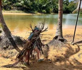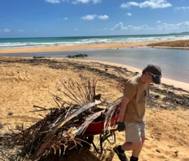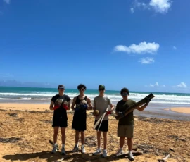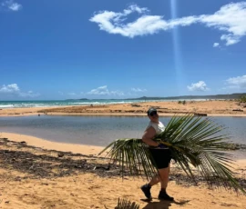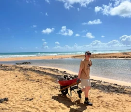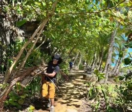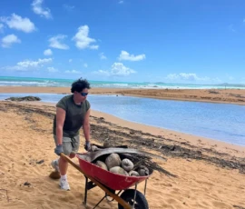 Then we walked over to the beach to meet up with Ramon. He talked us through his organzation and how Puerto Rico was invaded by the United States in 1898 and 90% of the island was dedicated to sugar cane production. He told us that the beach here in Luquillo is a significant nesting ground for leatherback turtles, or tinglares, as they’re known here. The large debris on the sand blocks their path, so we began cleaning objects on the beach like large branches coconuts and trash. Some people walked around with a trash bag and picked up trash. Others collected large bundles of branches and another group brought coconuts away in a wheelbarrow. Jack and Jesus broke open a coconut and drank some coconut water. Auden and Anna broke open a coconut and discovered some really big beetles. The mid-day got very hot, so wading in the cool river was perfect while we waited for our lunch of sandwiches and quesitos.